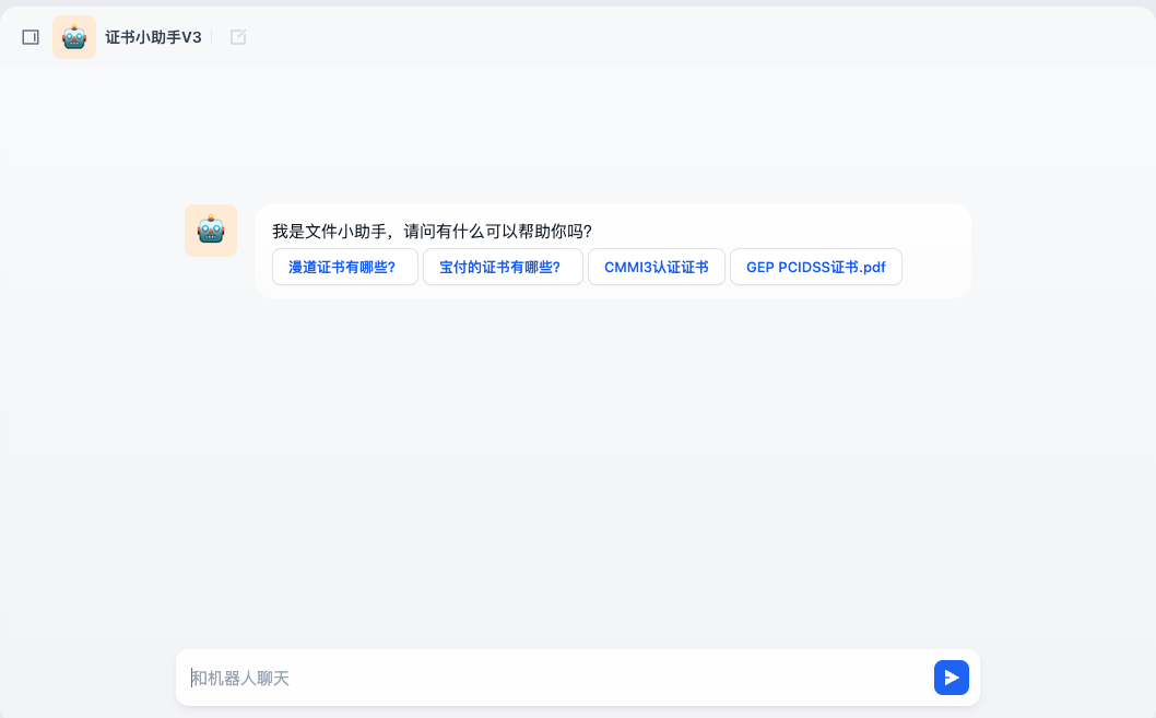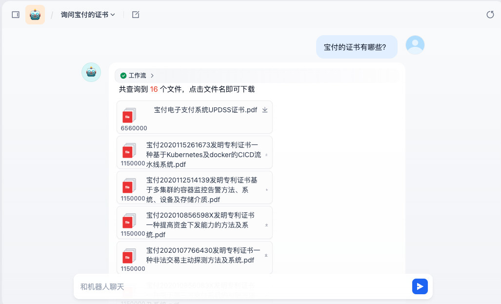 本手册是以AI对话方式为核心,通过AI对话框中输入需要查询文件的内容关键关如:“宝付”、“证书”关键词进行查询指令,AI将会根据输入的信息进行分析,返回需求文件列表,并提供目标文件点击即可下载功能,实现高效,便捷的文件获取体验。