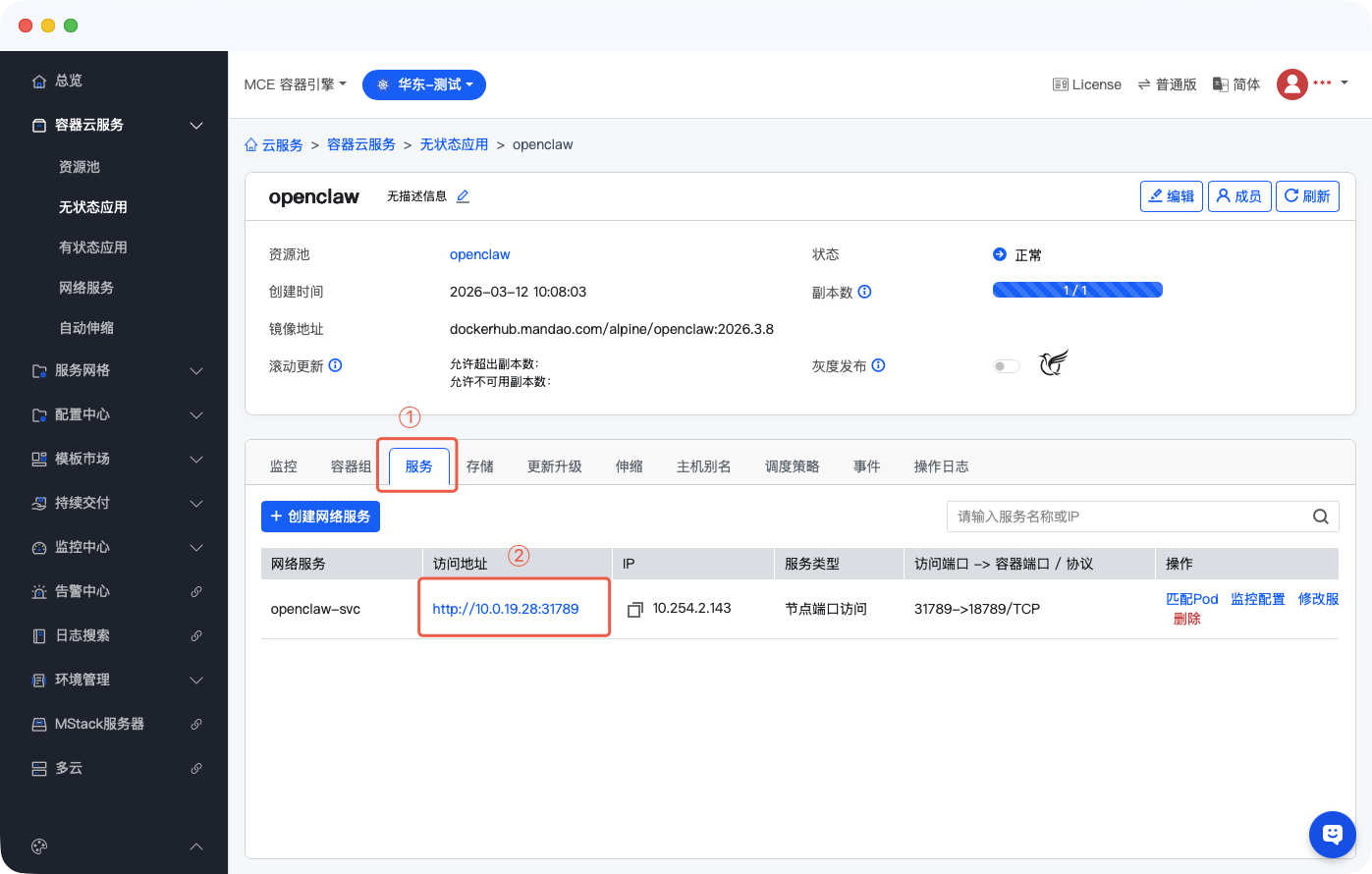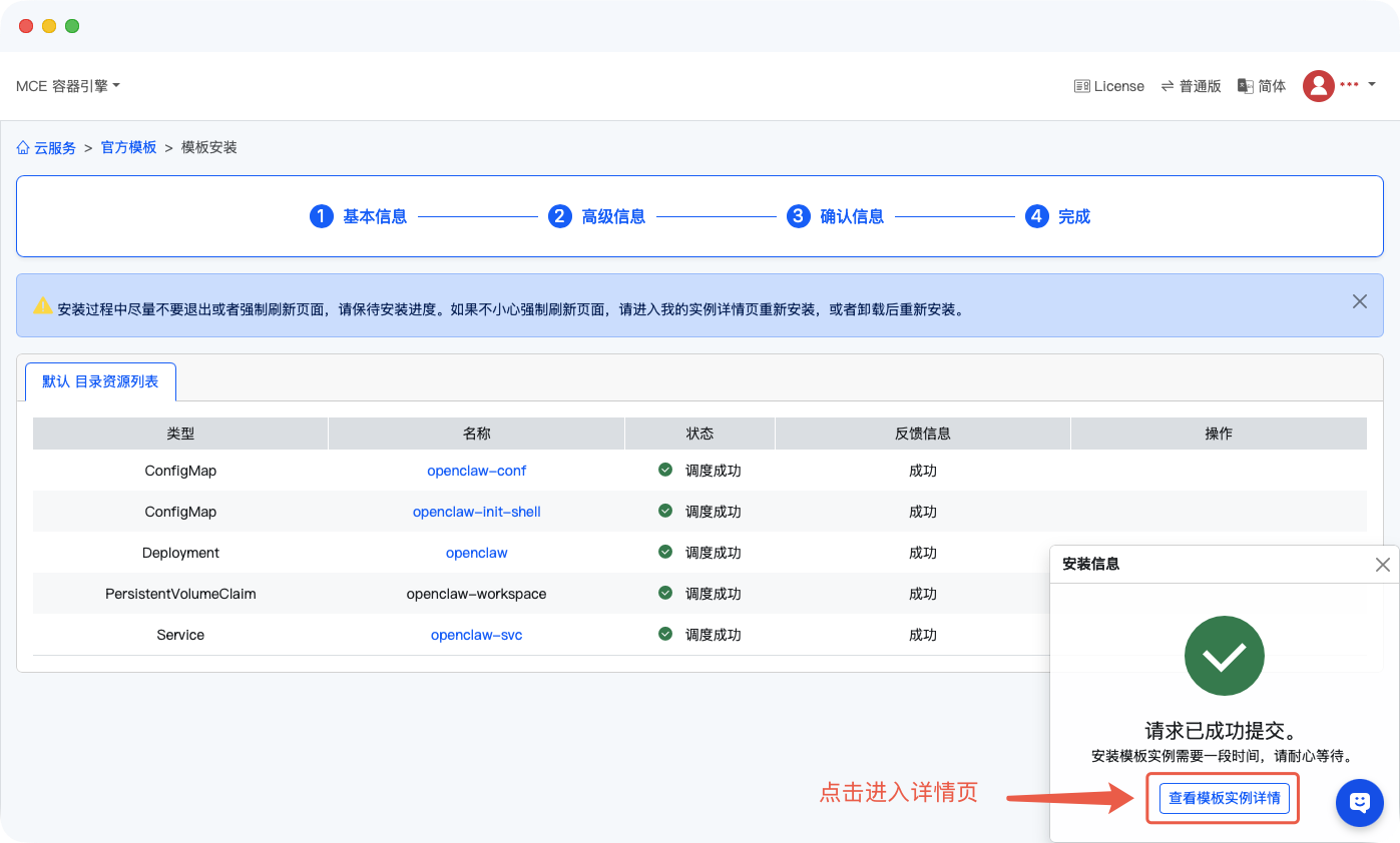 安装,耐心等待应用部署,弹出安装提示框后,点击查看模板实例详情,进入OpenClaw安装详情页。