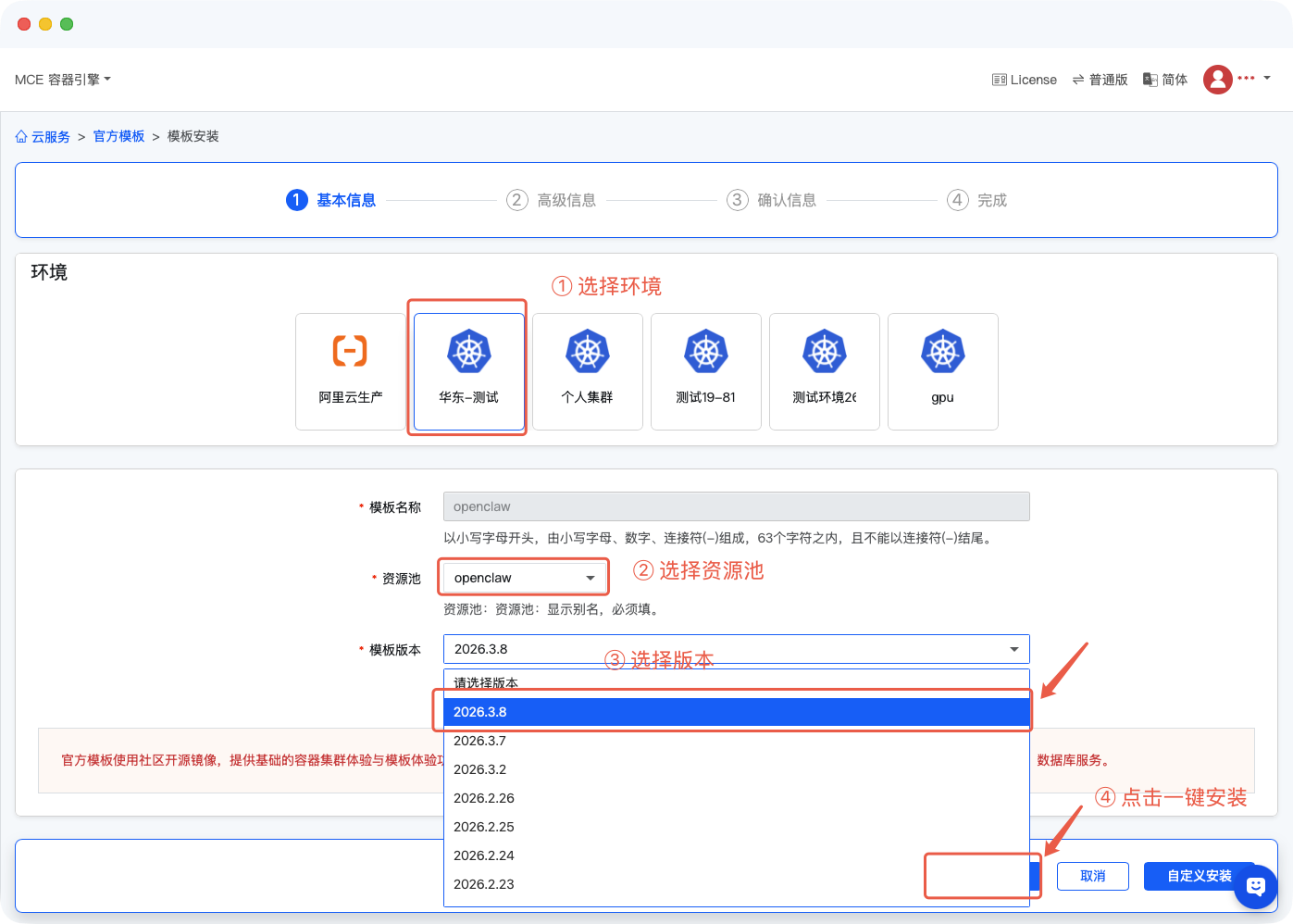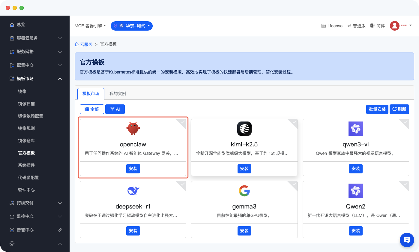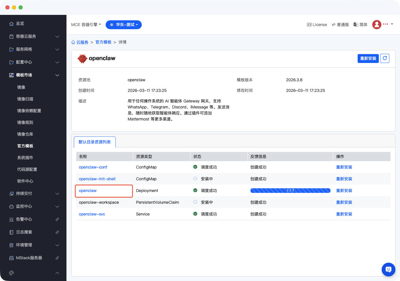 模板市场,在官方模版中,检索OpenClaw,单击安装。
