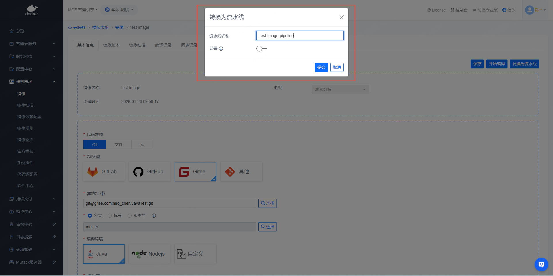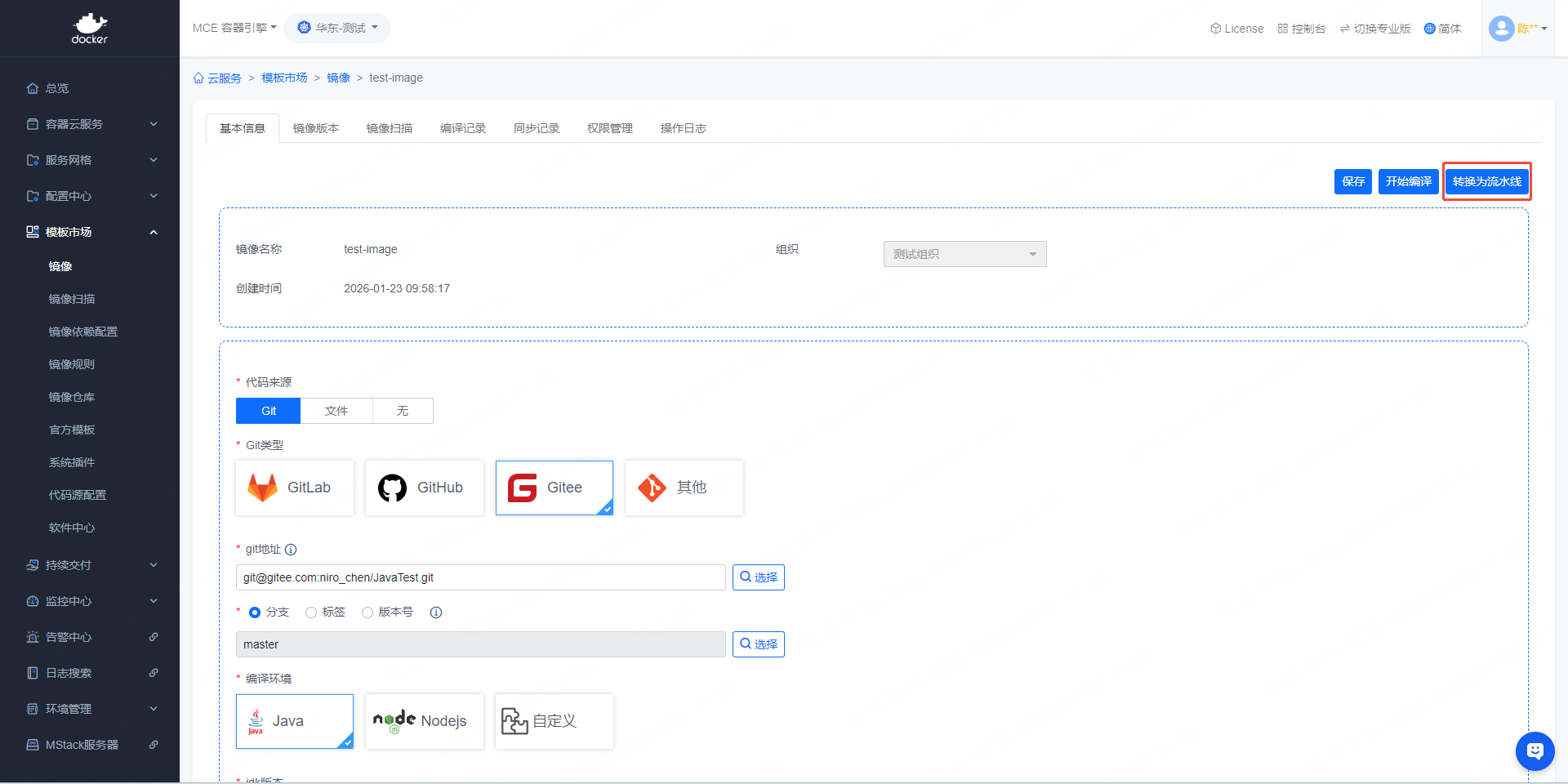 - 【转换为流水线】需要成功编译镜像一次以后才可使用,点击【转换为流水线】即可将当前的镜像配置转换为流水线配置