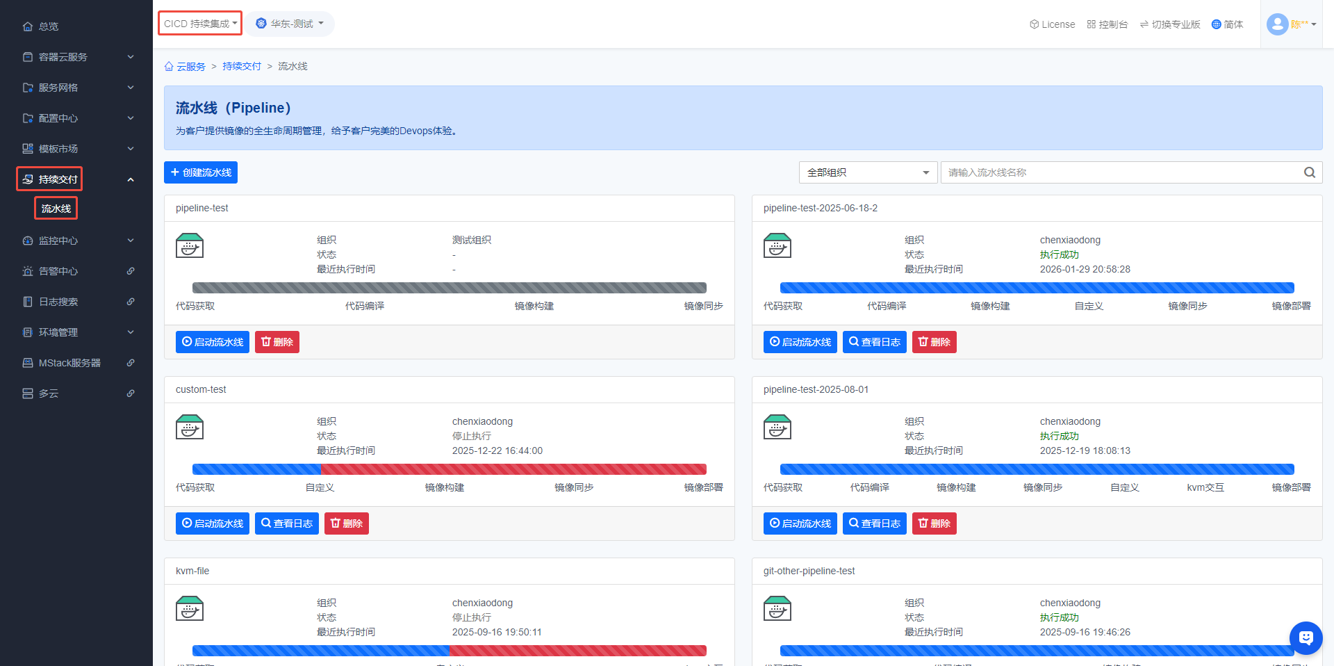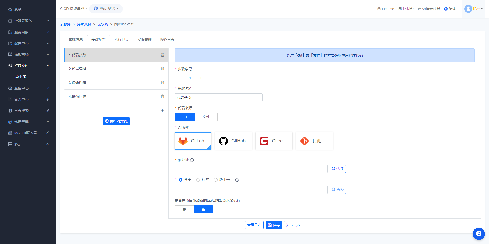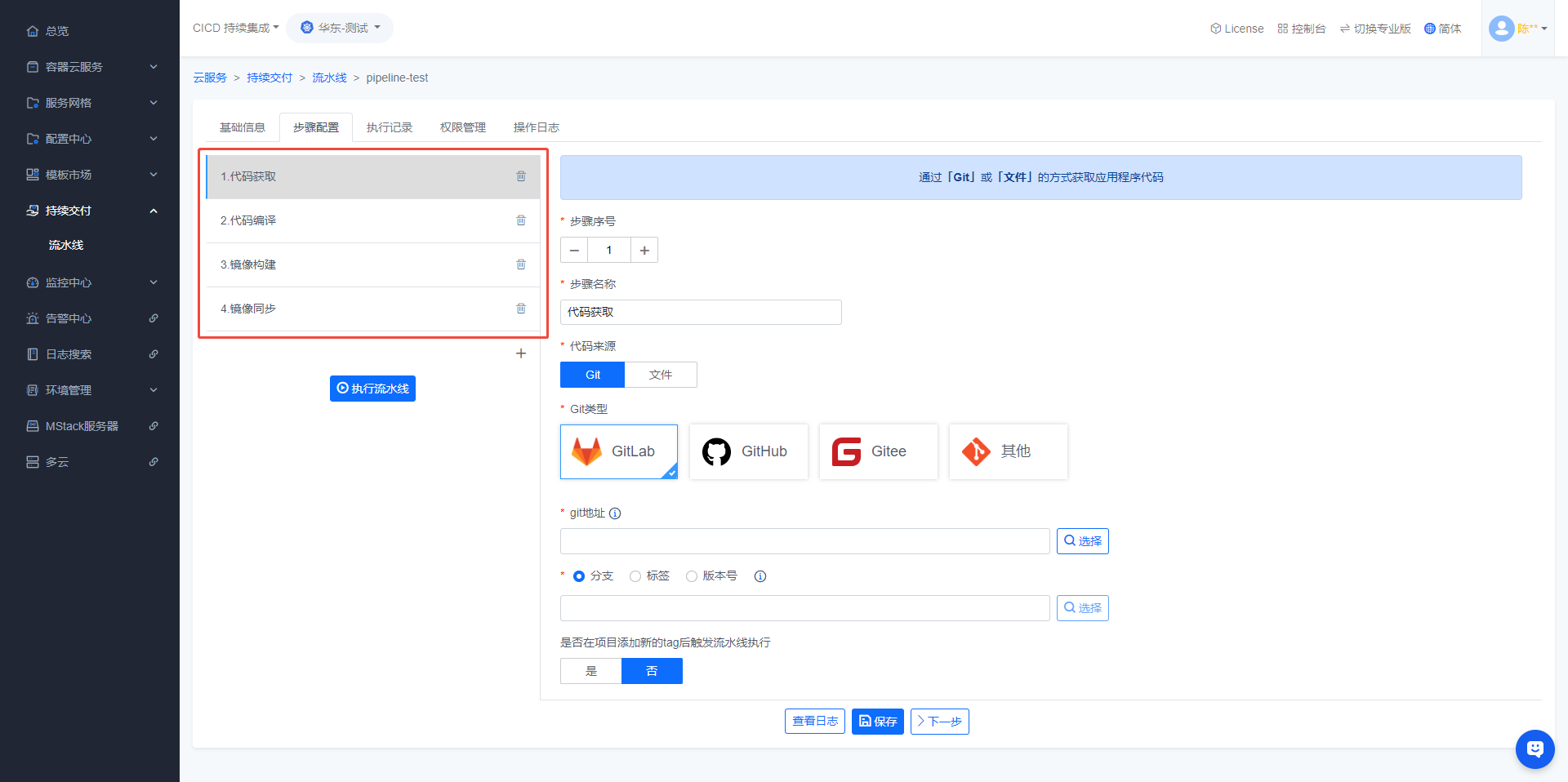 暂无相关搜索结果! 操作手册产品介绍什么是云容器引擎前言概述产品优势应用场景约束与限制计费说明权限管理基本概念快速入门如何运行一个Java应用如何运行一个NodeJS应用如何运行一个自定义应用容器云服务资源池创建扩容成员删除克隆无状态应用创建应用查看详情升级镜像挂载存储故障排查常见问题有状态应用守护进程普通任务定时任务工作负载-公共操作监控查询容器组存储更新升级镜像升级资源生命周期健康检查环境变量挂载主机别名容器组服务服务创建编辑编辑YAML删除负载均衡创建查看配置配置ssl自定义配置全局配置故障排查网络策略创建配置白名单删除存储创建编辑YAML定制资源YAML服务网格灰度发布蓝绿部署金丝雀发布流量镜像自制应用创建应用规则配置匹配规则重写重定向直接响应路由分配镜像流量超时重试故障注入配置中心配置创建变更密钥创建变更模板市场镜像创建镜像上传镜像镜像详情编译镜像代码来源Git代码源代码源绑定如何获取GitLab私有 token?GitLab站点地址绑定GitLab绑定GitHub绑定Gitee文件代码源文件目录编译环境java编译环境pom.xml路径编译包路径nodejs编译环境package.json路径非静态文件静态文件静态文件目录镜像构建添加文件到镜像镜像版本号如何将git项目里的某个文件或目录添加到镜像中dockerfile简单说明JarTomcatJettyNodejsNginxnginx.conf默认配置conf.d目录下的默认配置文件自定义镜像基础镜像仓库镜像同步修改镜像全名镜像保留个数镜像规则镜像锁定规则镜像同步规则镜像安全规则影响范围匹配规则转换为流水线镜像版本锁定/解锁镜像同步镜像编译记录同步记录镜像扫描编译镜像示例java镜像示例nodejs镜像示例nginx镜像示例自定义镜像示例镜像编译失败处理方法编译日志异常相关connect ETIMEDOUTnetwork Socket timeoutunauthorized: authentication requiredCannot find module 'chalk'镜像仓库官方模板简介安装模板管理实例使用示例zookeeper安装更新运维kafka安装更新运维mysql安装更新运维harbor导入系统插件自定义模板软件中心软件包管理镜像依赖配置创建镜像依赖配置显示名称持续交付流水线创建流水线配置流水线代码获取Git代码源GitLab挂载webhookGitHub挂载webhookGitee挂载webhook文件代码源代码编译镜像构建JarTomcatJettyNodejsNginx自定义镜像镜像同步镜像部署镜像扫描kvm交互自定义流水线示例编译并部署一个java镜像编译并部署一个nodejs-nginx镜像编译一个自定义镜像编译一个多代码源镜像日志检索日志插件日志检索日志安装配置集群管理接管集群集群管理区域化部署应用模板权限管理账户中心配置超级管理员超级管理员管理用户超级管理员如何新增用户超级管理员如何销毁用户超级管理员如何重置用户密码配置注册验证码开关组织管理简介创建组织成员管理添加组织成员移除组织成员修改组织成员权限权限管理常见问题如何根据实例IP查询实例信息项目Debug模式云平台如何配置coredns项目不断重启如何排查项目无法部署到主机如何解决项目无法拉取镜像如何排查项目存储挂载报错如何解决项目存储已被挂载如何解决部署教程基础环境安装X86架构部署arm64鲲鹏麒麟v10-sp3部署NFS存储安装容器云平台安装平台组件版本视频帮助集群类接管环境分配集群权限应用模板设置应用部署区域资源池创建资源池扩容资源池分配资源池权限项目类部署JAVA应用部署自定义应用挂载配置文件挂载持久化存储容器中下载文件如何进入调式模式镜像类上传镜像自定义模板新增编译JDK版本更新动态版本发布说明3.x版本说明2.x版本说明1.x版本说明基础镜像版本升级说明性能测试服务快速入门JMeter压测快速入门OpenAPI快速入门在线调试OpenAPI容器接口在线调试镜像接口在线调试开发指南构造请求认证方式返回结果附录状态码 配置流水线 修改时间: 2026-03-11T18:45:09+08:00 阅读次数:800 分享 下载 PDF Word Markdown 一、进入流水线管理页面二、点击【流水线】进入【步骤配置】一、进入流水线管理页面 登录系统后,顶部选择【MCE容器引擎】左侧导航栏依次点击【模板市场】->【流水线】,即可进入流水线管理页面二、点击【流水线】进入【步骤配置】 在流水线管理页面找到需要配置的流水线,之后点击该流水线 点击流水线会跳转到流水线详情的【步骤配置】页面,可以在该页面配置流水线 【步骤配置】页面,点击左侧【导航栏】可以切换不同的【步骤】作者:陈晓东 创建时间:2019-10-10 19:19最后编辑:陈晓东 更新时间:2026-03-04 17:23