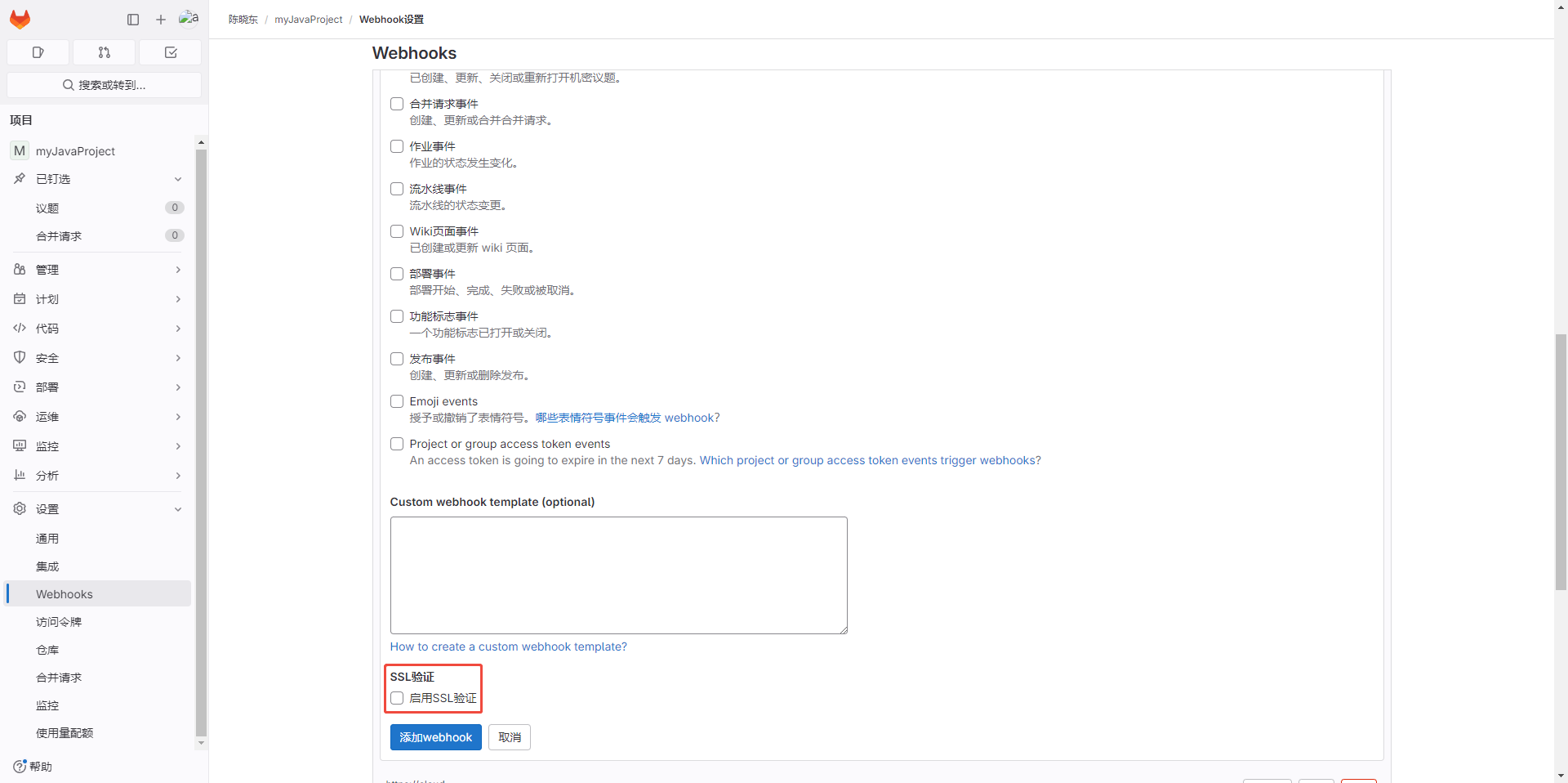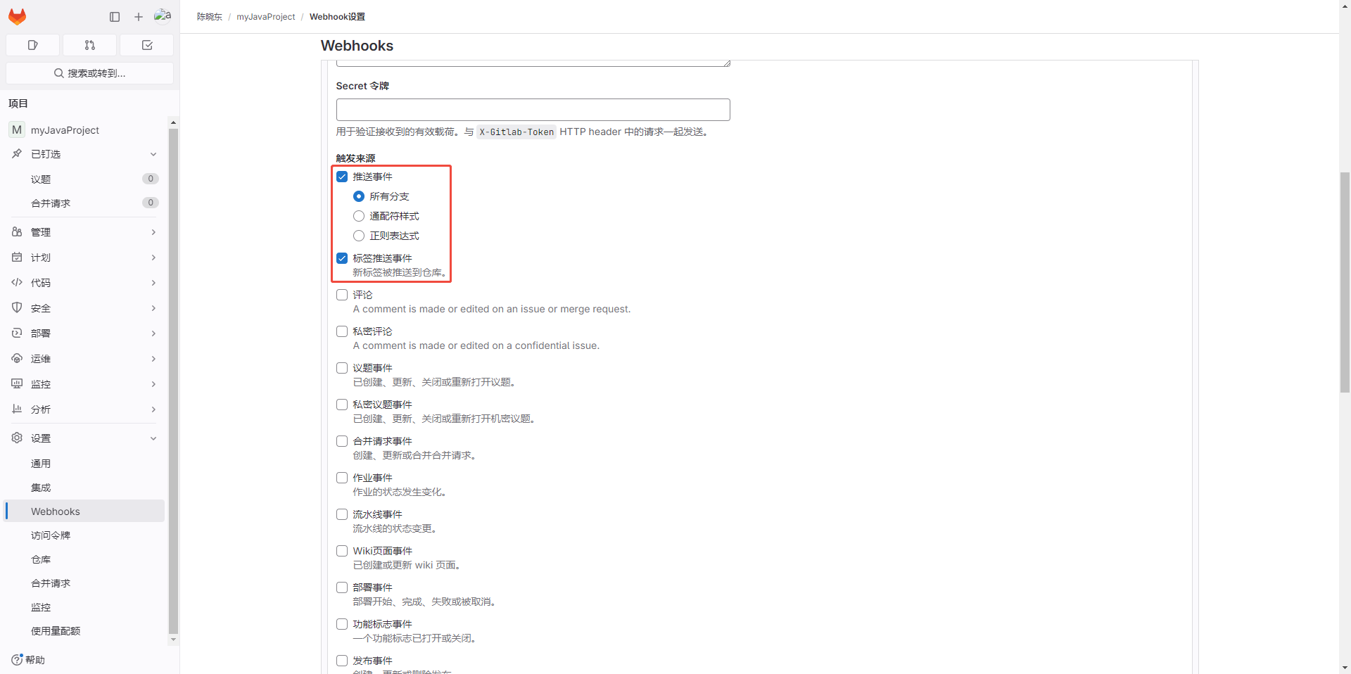 GitLab使用Webhook前需确认您的账号有【webhook权限】,并且GitLab需设置允许接收webhook请求