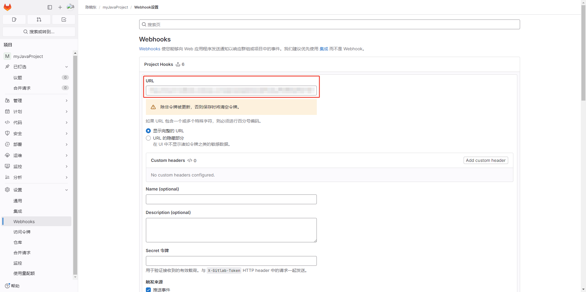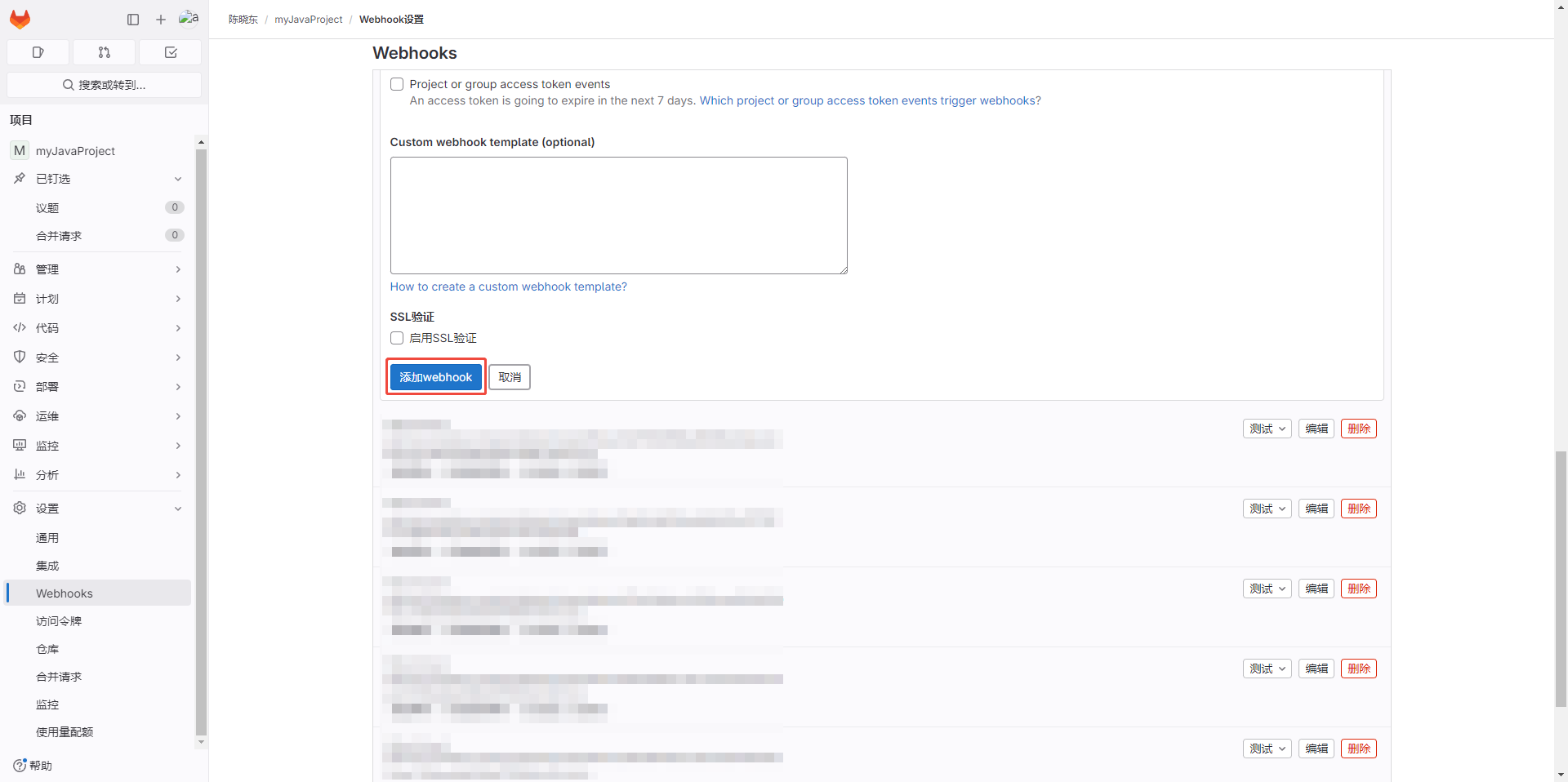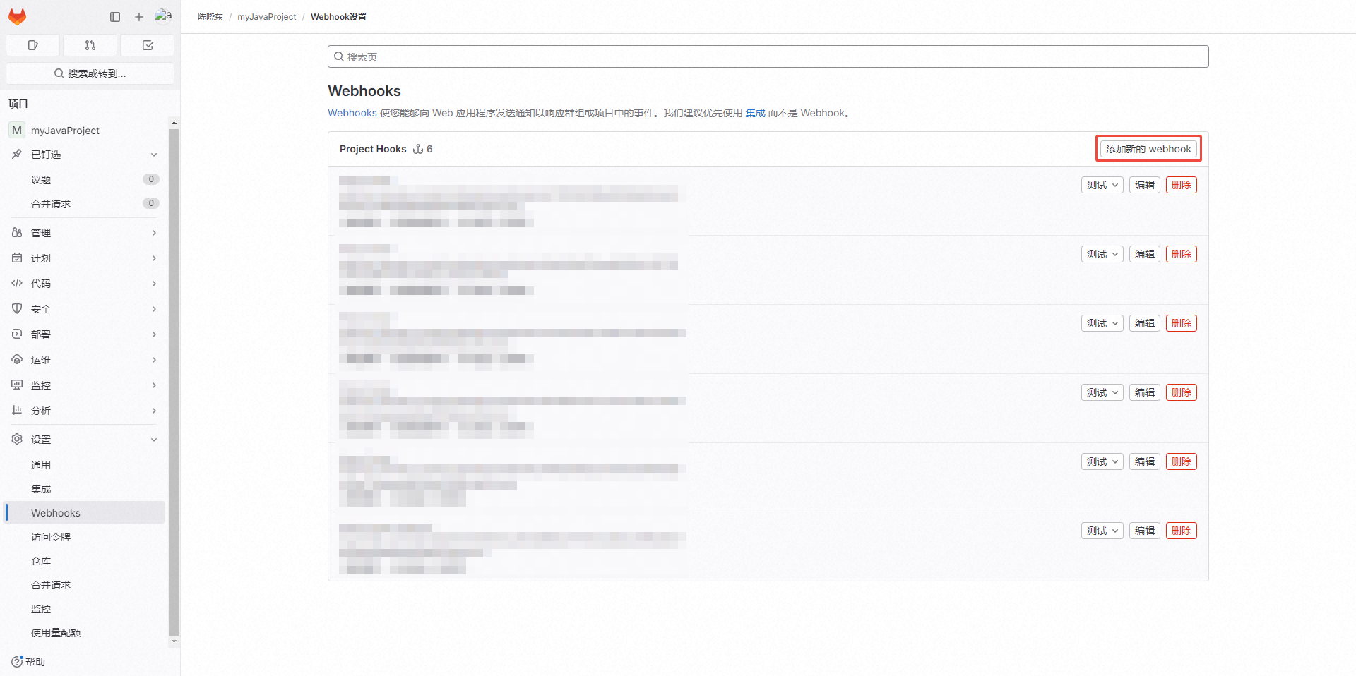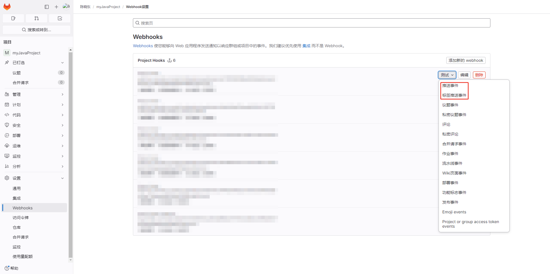 - 添加成功后可以【Project Hooks】看到添加的webhook,可点击【测试】,测试webhook是否可用