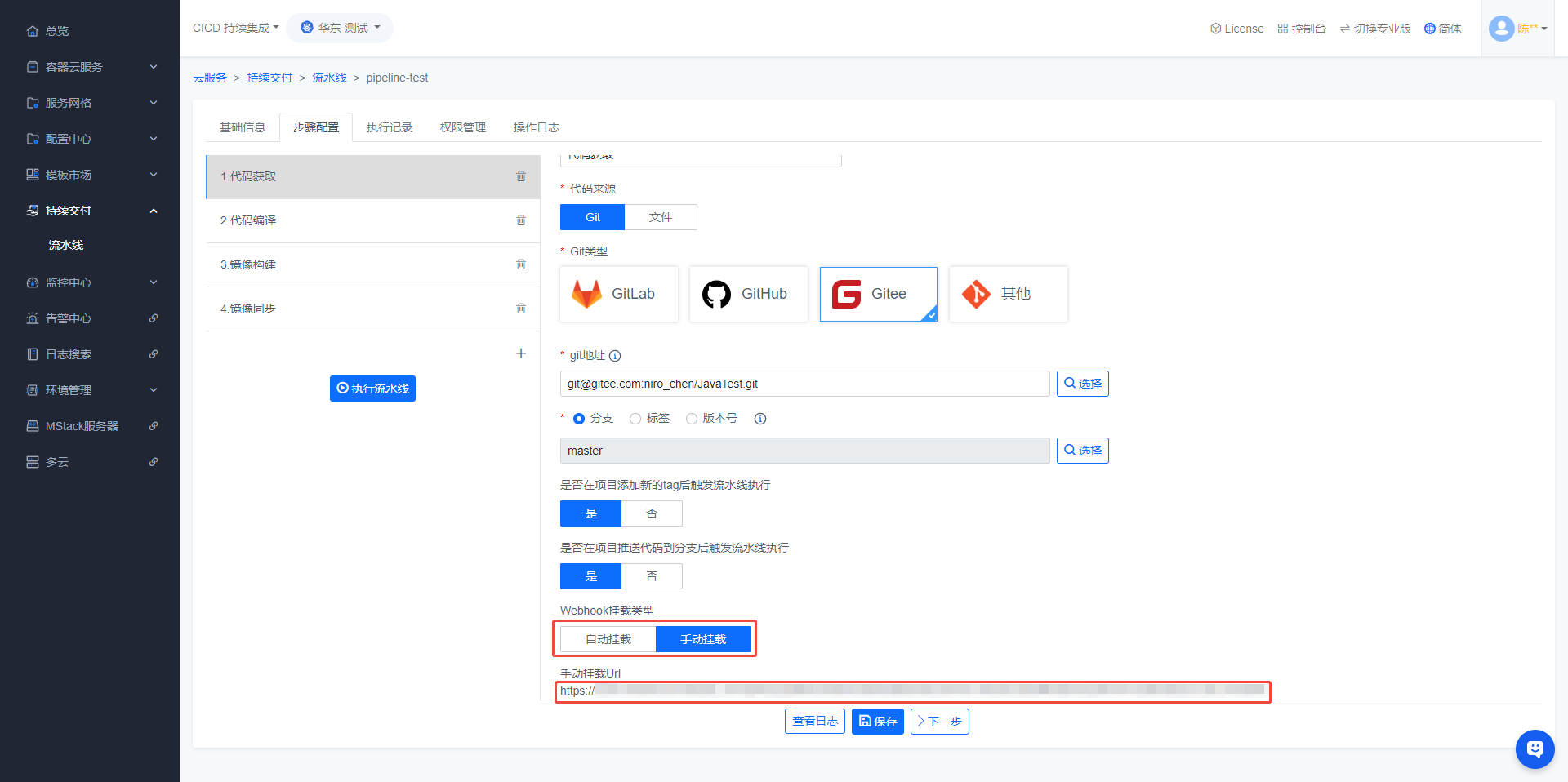 - 回到容器云,【Webhook挂载类型】选择【Webhook挂载类型】,复制【手动挂载Url】
