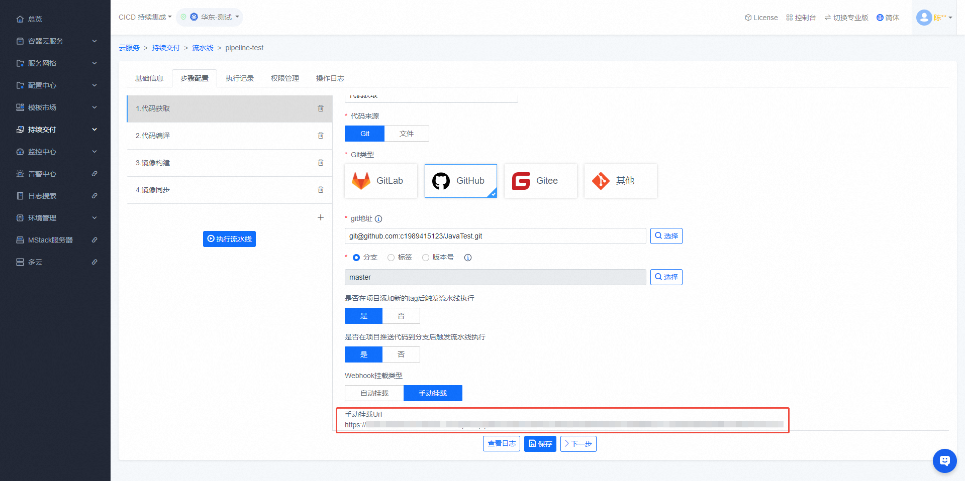 - 回到容器云,【Webhook挂载类型】选择【Webhook挂载类型】,复制【手动挂载Url】