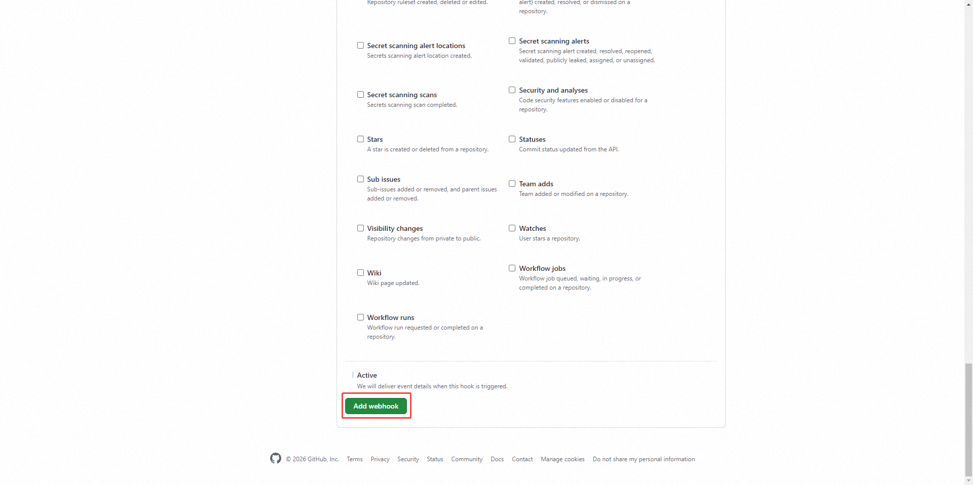 - 勾选【Let me select individual events】,根据需求勾选【Branch or tag creation】及【Pushes】