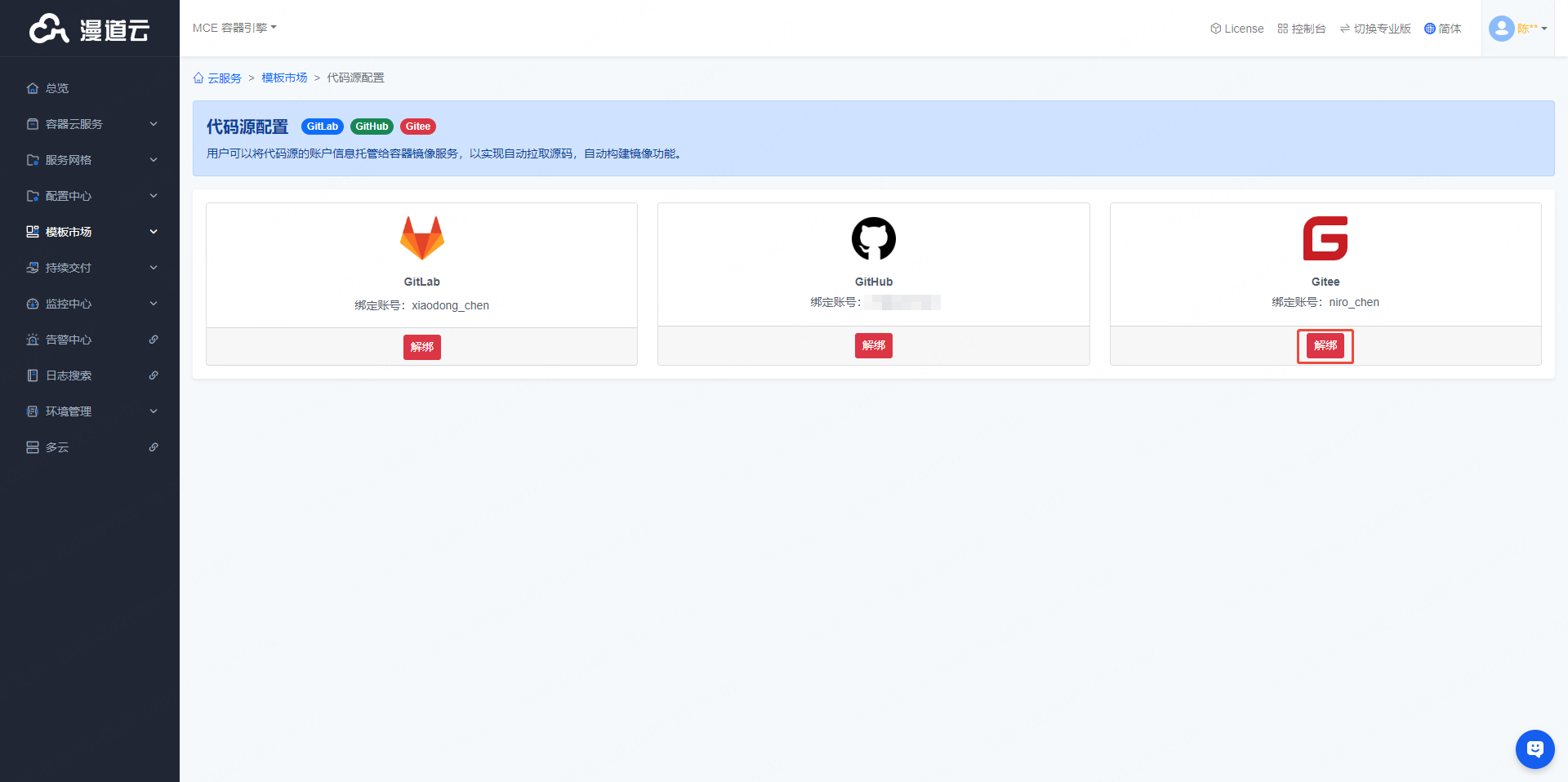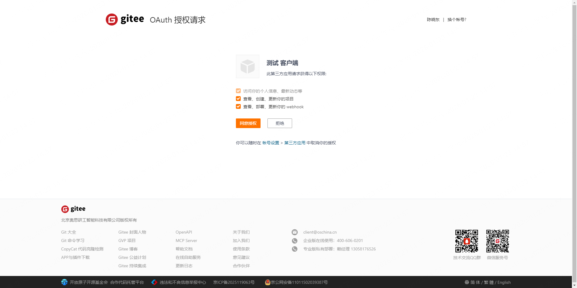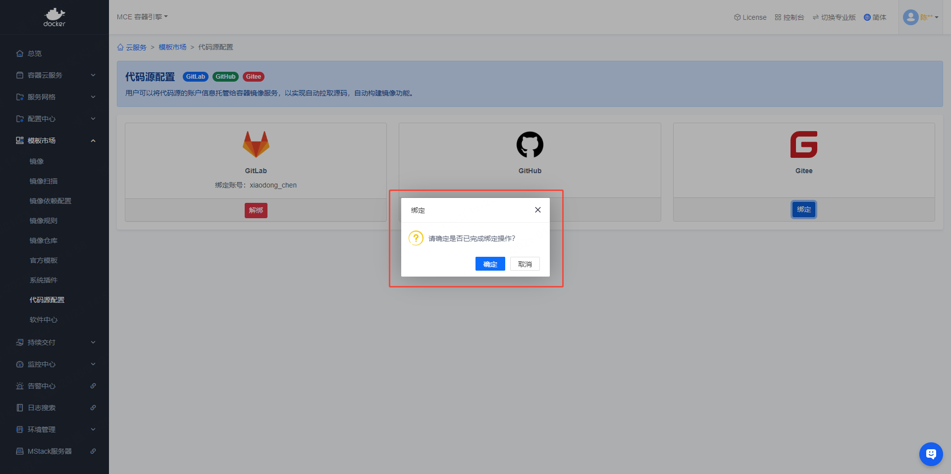 暂无相关搜索结果! 操作手册产品介绍什么是云容器引擎前言概述产品优势应用场景约束与限制计费说明权限管理基本概念快速入门如何运行一个Java应用如何运行一个NodeJS应用如何运行一个自定义应用容器云服务资源池创建扩容成员删除克隆无状态应用创建应用查看详情升级镜像挂载存储故障排查常见问题有状态应用守护进程普通任务定时任务工作负载-公共操作监控查询容器组存储更新升级镜像升级资源生命周期健康检查环境变量挂载主机别名容器组服务服务创建编辑编辑YAML删除负载均衡创建查看配置配置ssl自定义配置全局配置故障排查网络策略创建配置白名单删除存储创建编辑YAML定制资源YAML服务网格灰度发布蓝绿部署金丝雀发布流量镜像自制应用创建应用规则配置匹配规则重写重定向直接响应路由分配镜像流量超时重试故障注入配置中心配置创建变更密钥创建变更模板市场镜像创建镜像镜像详情编译镜像代码来源Git代码源代码源绑定如何获取GitLab私有 token?GitLab站点地址绑定GitLab绑定GitHub绑定Gitee文件代码源文件目录编译环境java编译环境pom.xml路径编译包路径nodejs编译环境package.json路径非静态文件静态文件静态文件目录镜像构建conf.d目录下的默认配置文件nginx.conf默认配置添加文件到镜像镜像版本号如何将git项目里的某个文件或目录添加到镜像中dockerfile简单说明镜像类型关联参数镜像类型与编译环境的关系目标镜像仓库修改镜像全名镜像保留个数镜像规则镜像锁定规则镜像同步规则镜像安全规则影响范围匹配规则转换为流水线镜像版本锁定/解锁镜像同步镜像编译记录同步记录镜像扫描编译镜像示例java镜像示例nodejs镜像示例nginx镜像示例自定义镜像示例如何增加maven版本镜像编译失败处理方法编译日志异常相关connect ETIMEDOUTnetwork Socket timeoutunauthorized: authentication requiredCannot find module 'chalk'镜像仓库创建镜像仓库官方模板简介安装模板管理实例使用示例zookeeper安装更新运维kafka安装更新运维mysql安装更新运维harbor导入系统插件自定义模板软件中心简介软件包管理镜像依赖配置创建镜像依赖配置配置名称解压后的文件名jdk镜像推送仓库jdk镜像名称持续交付流水线创建流水线配置流水线代码获取Git代码源配置说明Webhook使用说明GitLab挂载webhook查看是否拥有webhook权限GitLab设置允许接收webhook请求GitHub挂载webhookGitee挂载webhook文件代码源配置说明代码编译Java编译环境Nodejs编译环境自定义编译环境镜像构建Jar镜像Tomcat镜像Jetty镜像Nodejs镜像Nginx镜像自定义镜像基础镜像仓库镜像同步镜像规则镜像规则与流水线关联配置镜像锁定规则创建镜像锁定规则镜像同步规则创建镜像同步规则镜像安全规则配置镜像安全规则镜像部署部署到已有的项目镜像扫描kvm交互自定义如何使用流水线?编译并部署一个java镜像编译并部署一个nodejs镜像编译并部署一个nginx镜像编译一个自定义镜像编译一个多代码源镜像日志检索日志插件日志检索日志安装配置集群管理接管集群集群管理区域化部署应用模板权限管理账户中心配置超级管理员超级管理员管理用户超级管理员如何新增用户超级管理员如何销毁用户超级管理员如何重置用户密码配置注册验证码开关组织管理简介创建组织成员管理添加组织成员移除组织成员修改组织成员权限权限管理常见问题如何根据实例IP查询实例信息项目Debug模式云平台如何配置coredns项目不断重启如何排查项目无法部署到主机如何解决项目无法拉取镜像如何排查项目存储挂载报错如何解决部署教程基础环境安装X86架构部署arm64鲲鹏麒麟v10-sp3部署NFS存储安装容器云平台安装平台组件版本视频帮助集群类接管环境分配集群权限应用模板设置应用部署区域资源池创建资源池扩容资源池分配资源池权限项目类部署JAVA应用部署自定义应用挂载配置文件挂载持久化存储容器中下载文件如何进入调式模式镜像类上传镜像自定义模板新增编译JDK版本更新动态版本发布说明3.x版本说明2.x版本说明1.x版本说明基础镜像版本升级说明性能测试服务快速入门JMeter压测快速入门OpenAPI快速入门在线调试OpenAPI容器接口在线调试镜像接口在线调试开发指南构造请求认证方式返回结果附录状态码 绑定Gitee 修改时间: 2026-01-30T18:08:24+08:00 阅读次数:886 分享 下载 PDF Word Markdown 绑定Gitee账户一、点击【绑定】二、登录Gitee三、确认授权四、完成绑定绑定Gitee账户一、点击【绑定】二、登录Gitee三、确认授权 勾选【查看、创建、更新你的项目】及【查看、部署、更新你的 webhook】,并点击【同意授权】四、完成绑定 授权成功后页面会跳转显示【绑定成功】 回到代码源配置页面,会填出【请确定是否已完成绑定操作?】的确认框,点击【确定】 Gitee绑定成功,显示【解绑】按钮作者:陈晓东 创建时间:2020-08-17 15:10最后编辑:陈晓东 更新时间:2026-01-30 18:08