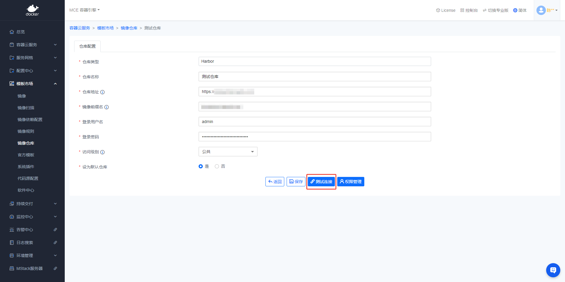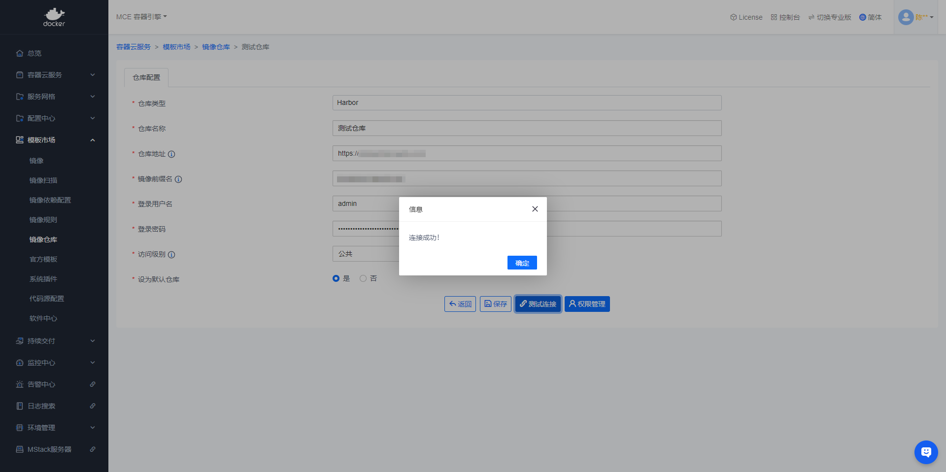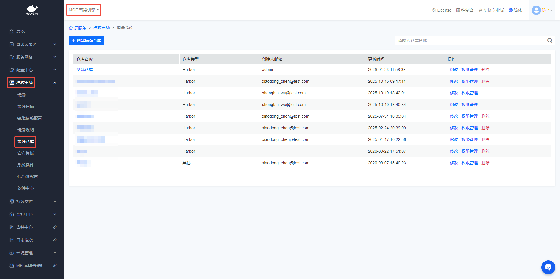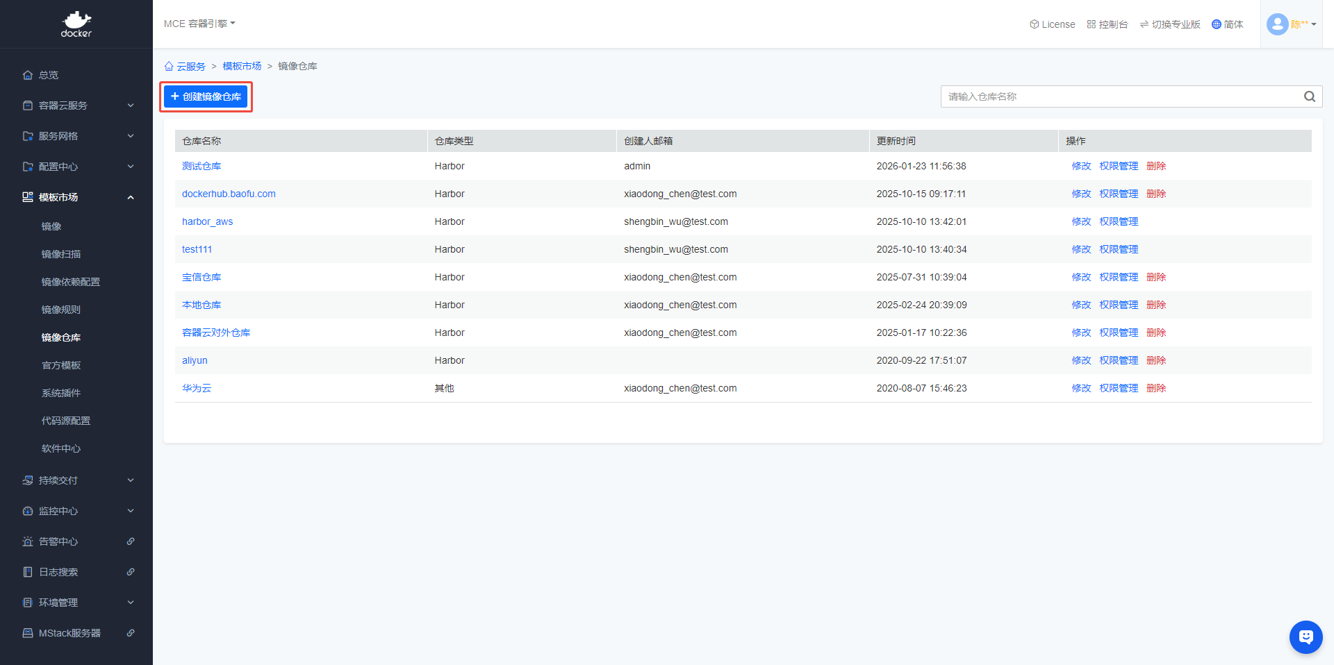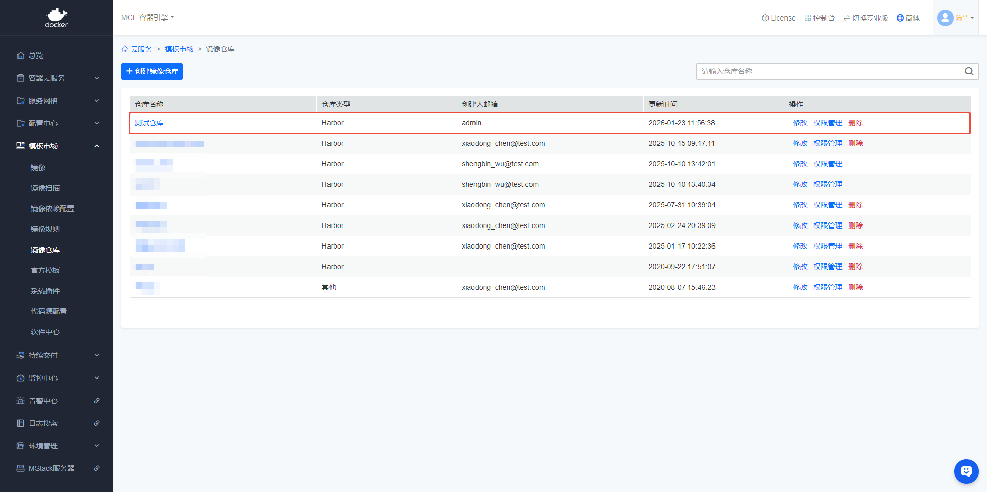 - 左侧导航栏依次点击【模板市场】->【镜像仓库】,即可进入镜像仓库管理页面