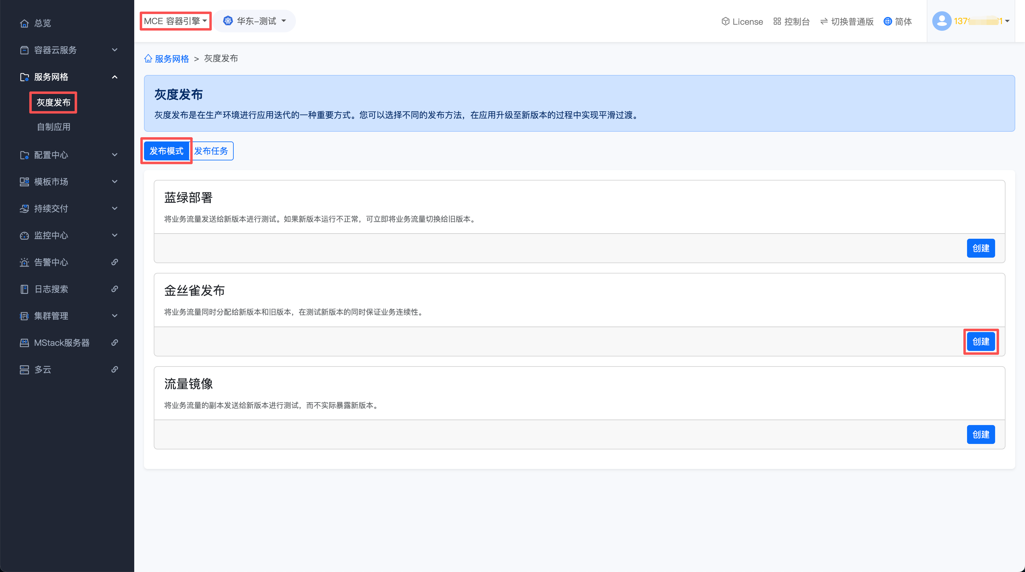 - 选择【发布模式】,点击金丝雀发布对应的【创建】按钮,即可进入创建灰度发布页面。