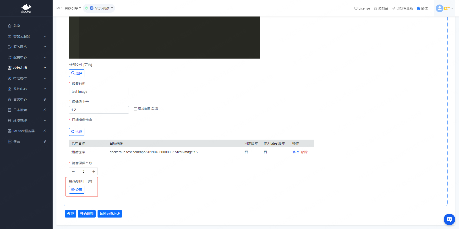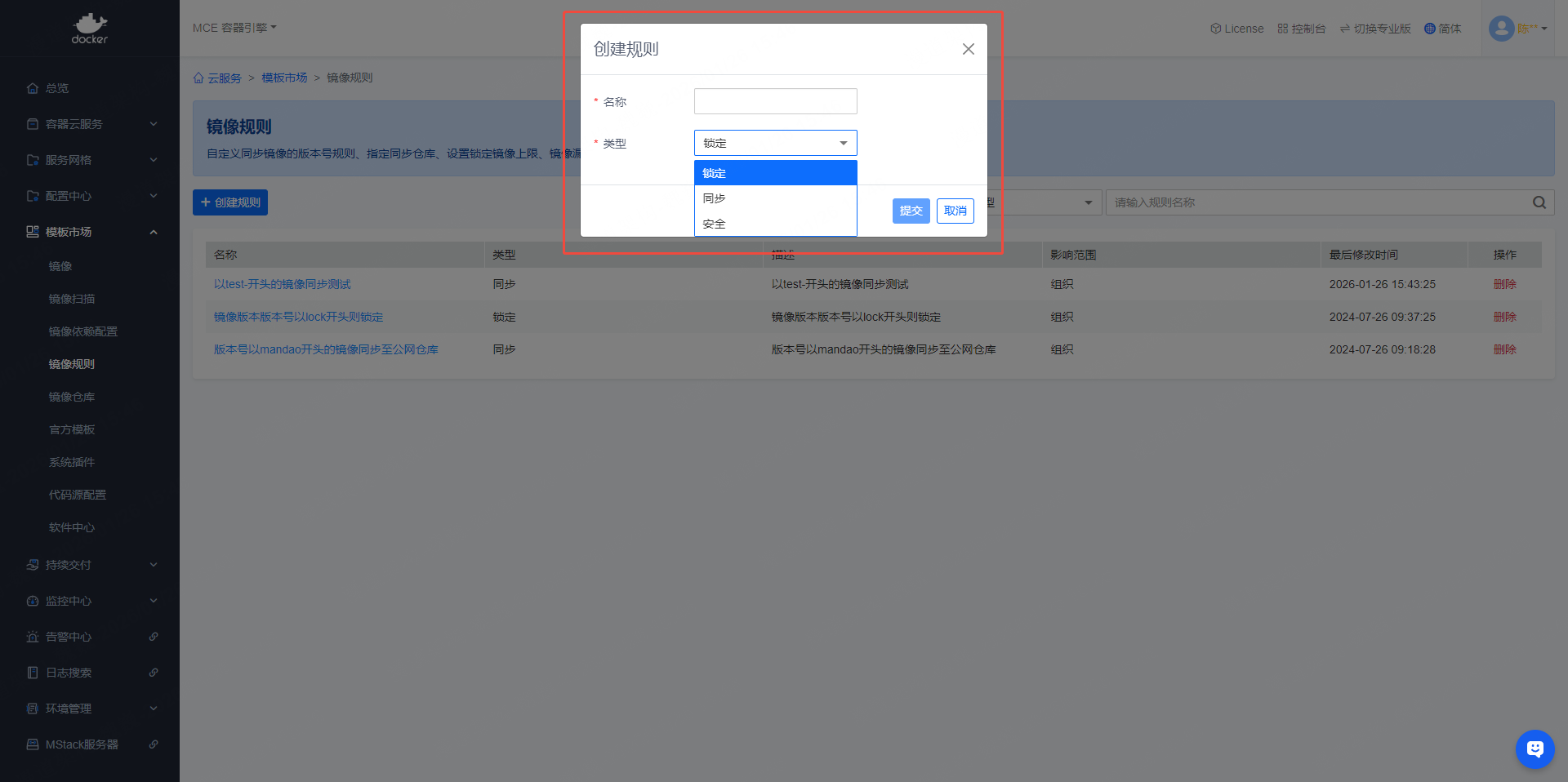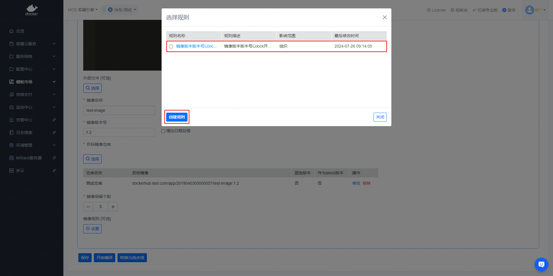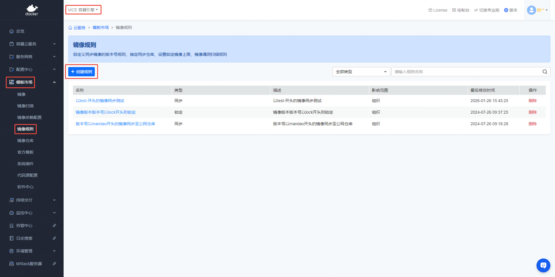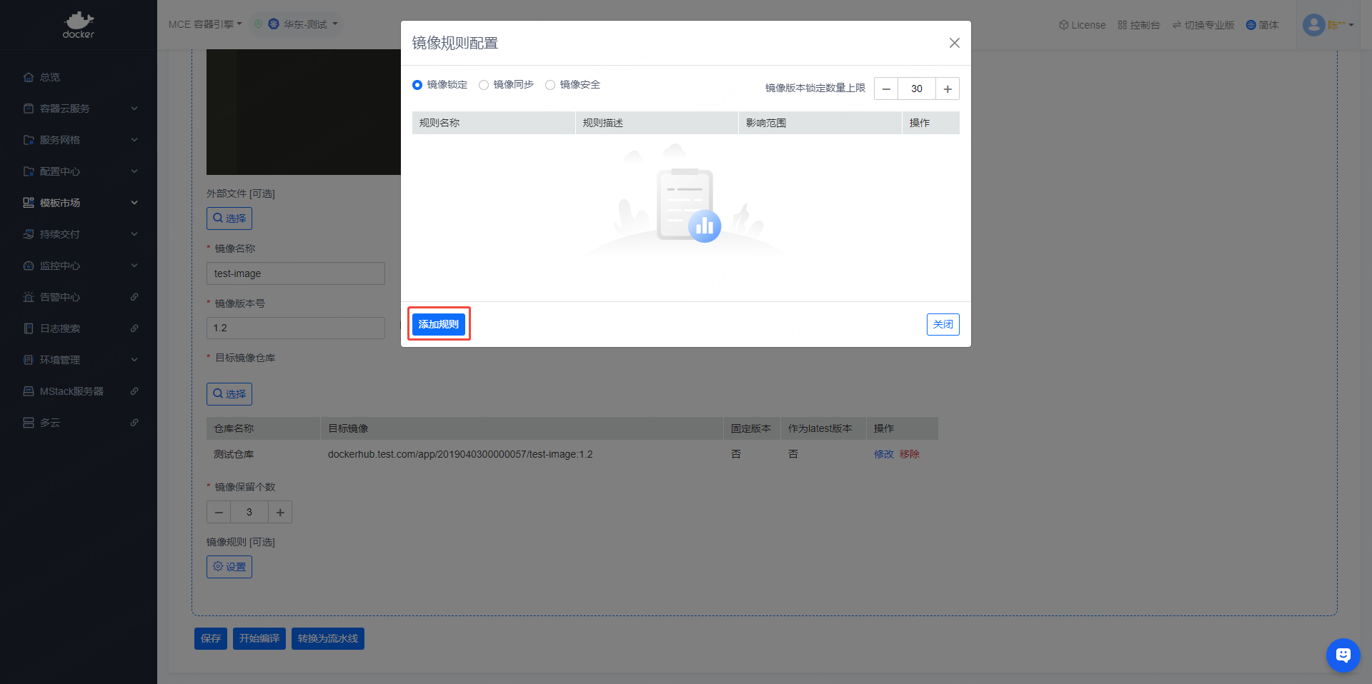- 左侧导航栏依次点击【模板市场】->【镜像规则】