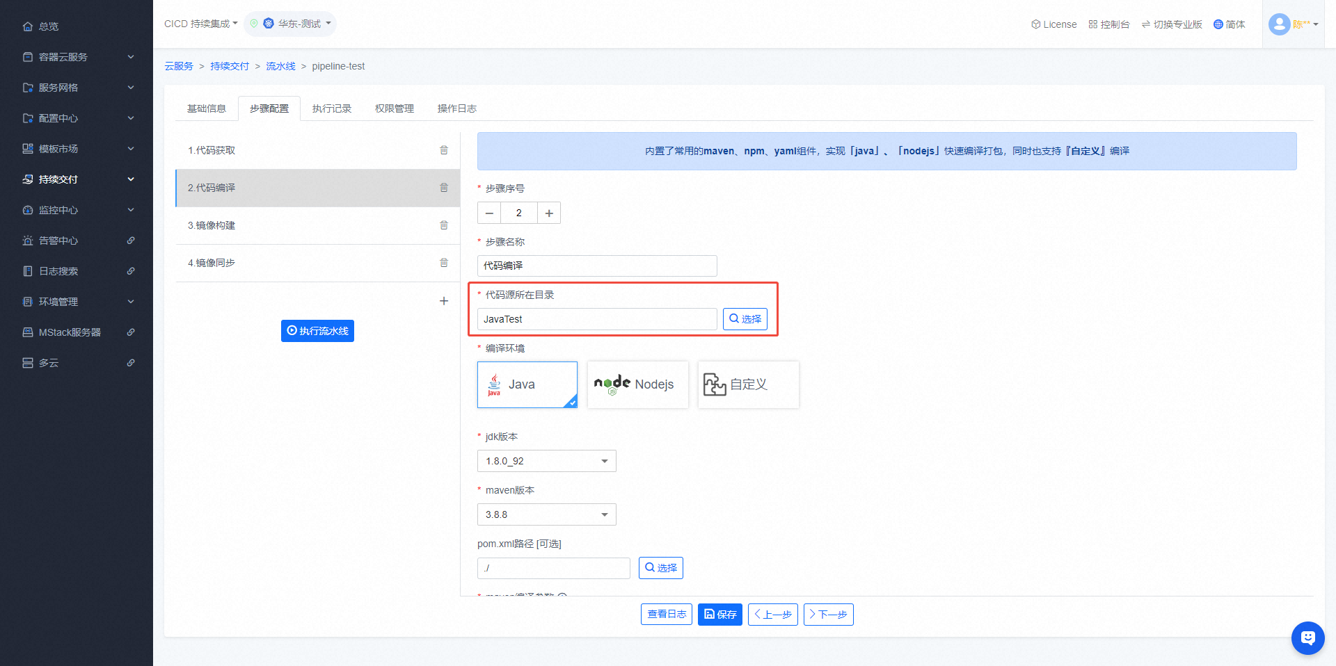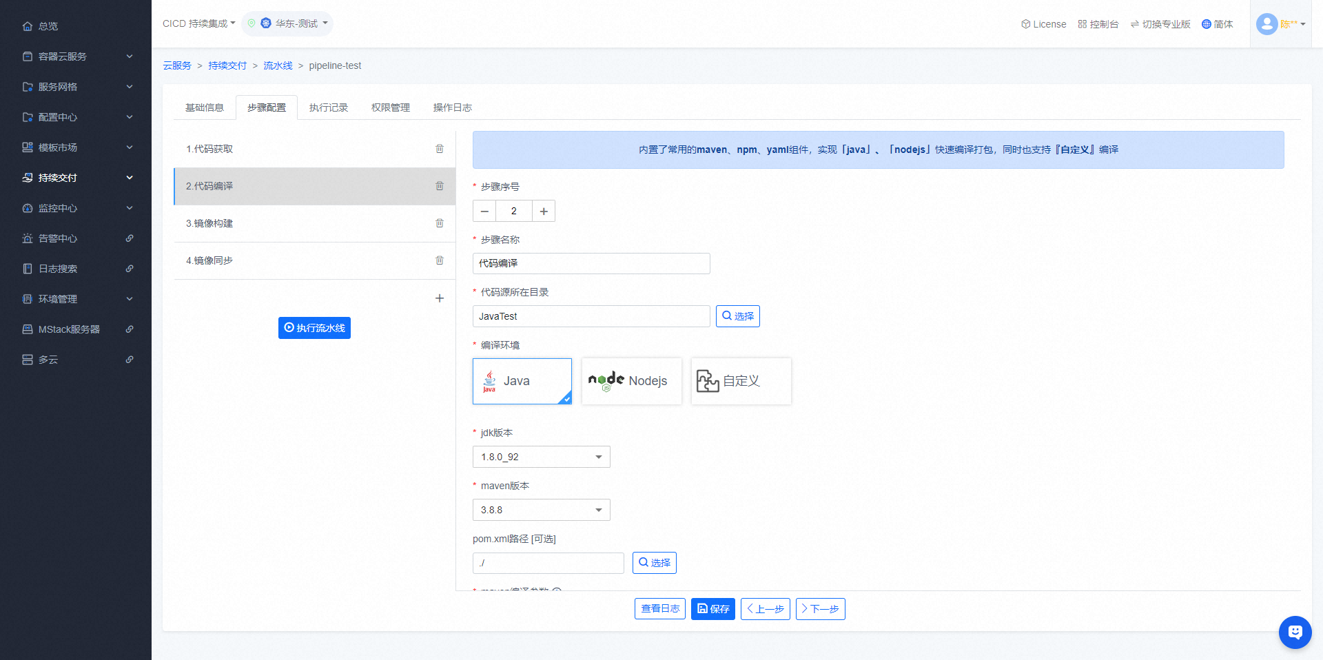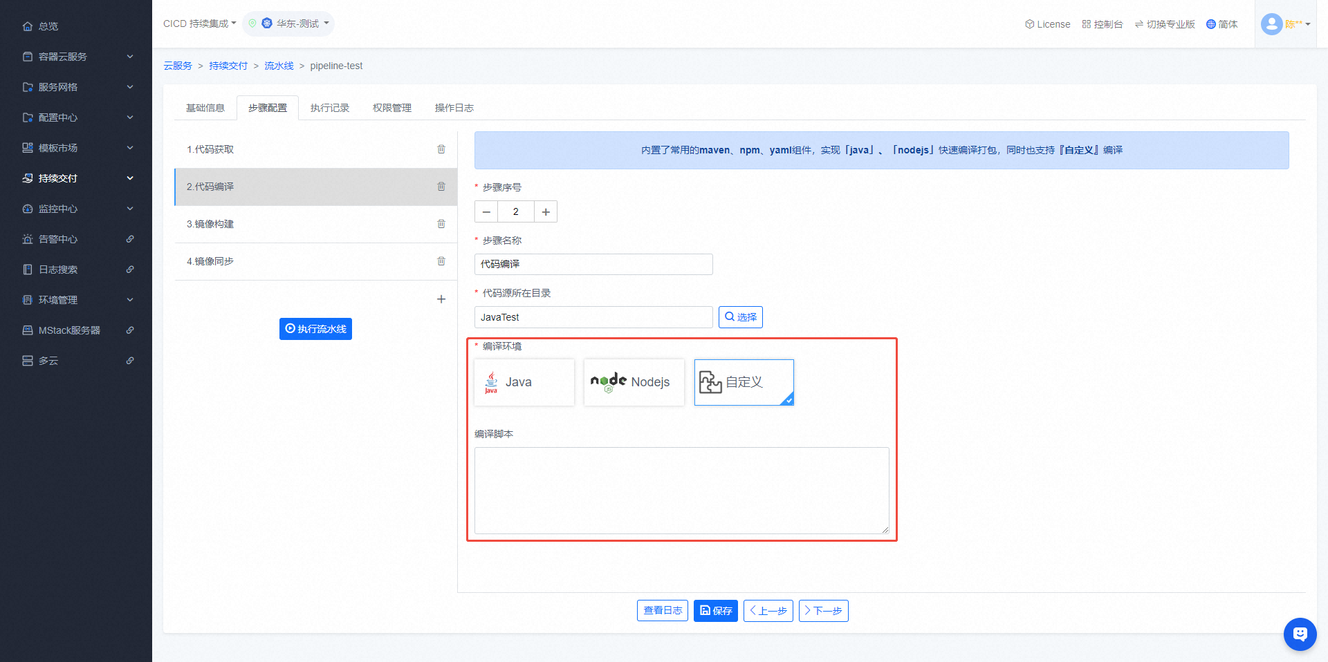 - 可在【代码编译】步骤编译项目代码,需要与【代码获取】步骤共同使用,支持java、nodejs、自定义