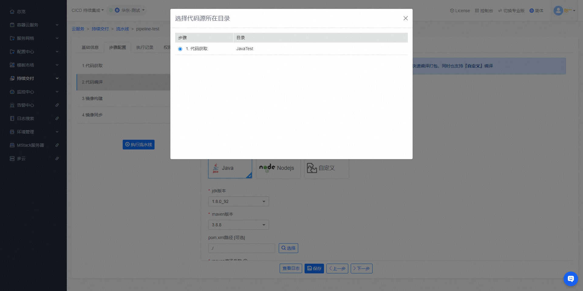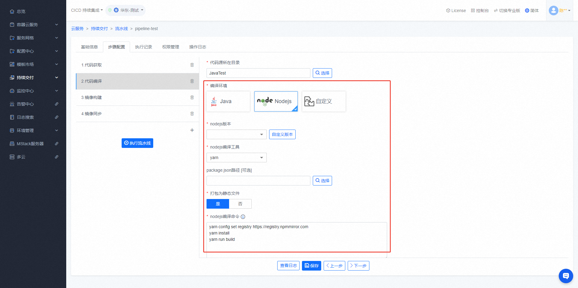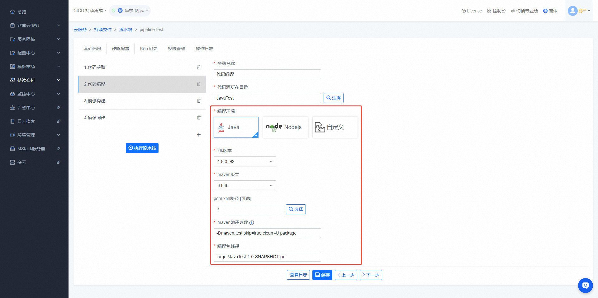 - 可在【代码编译】步骤编译项目代码,需要与【代码获取】步骤共同使用,支持java、nodejs、自定义