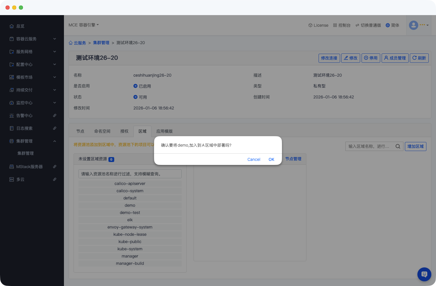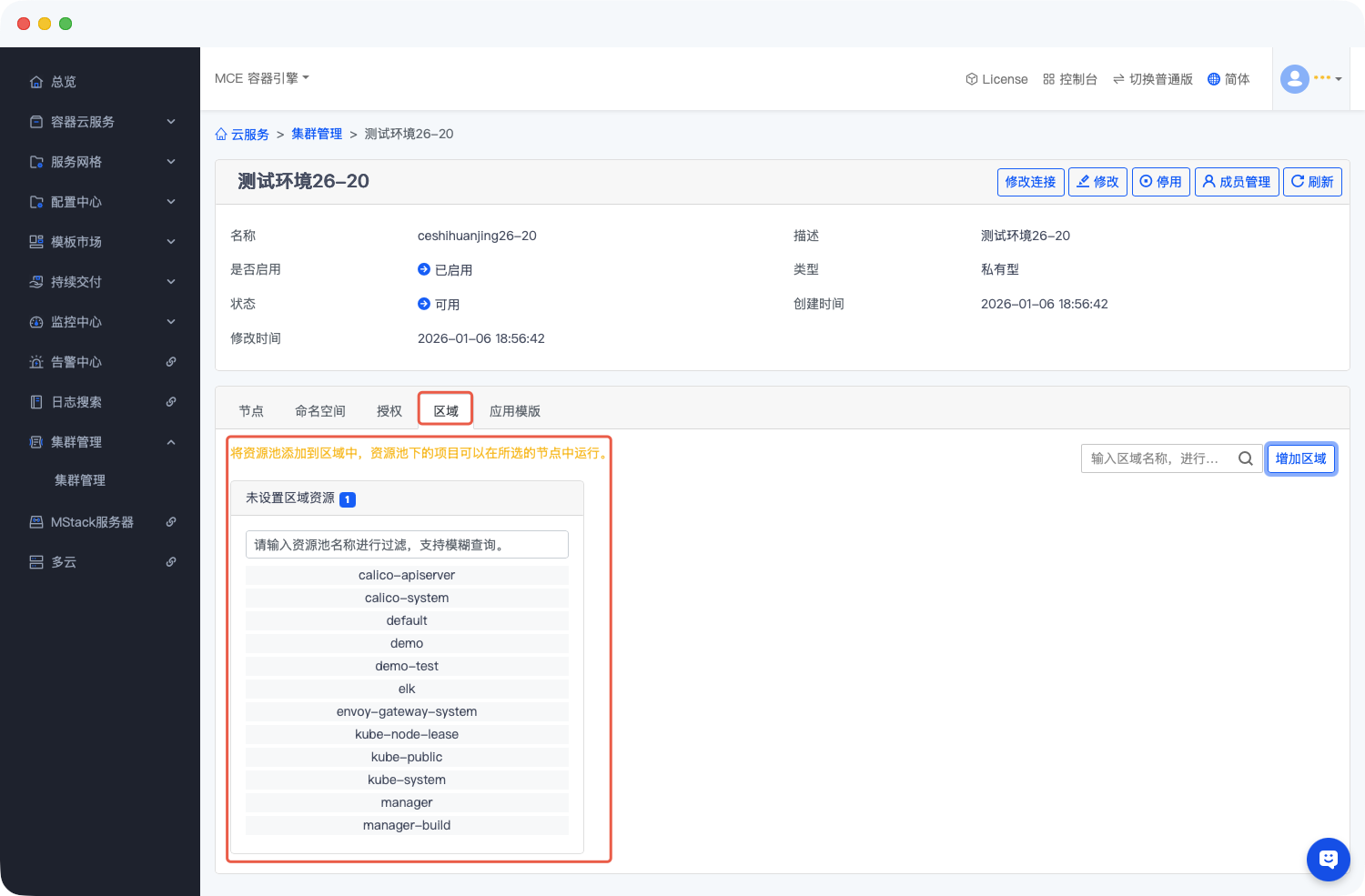规范集群区域配置流程,明确命名空间与节点区域的绑定操作标准,确保项目精准部署至指定节点区域,保障集群资源调度的合理性与业务部署的准确性。