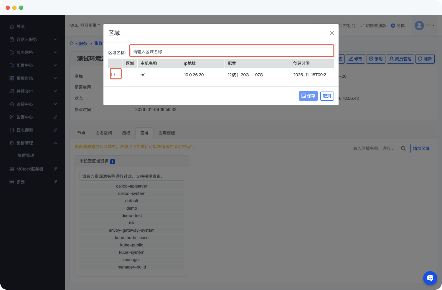- 右侧面板:展示当前集群可配置的节点区域列表,区域命名遵循固定规则:“area-可变标识”(其中“area”为固定前缀,后续可变标识如“A”“生产-01”等可根据业务需求自定义)。