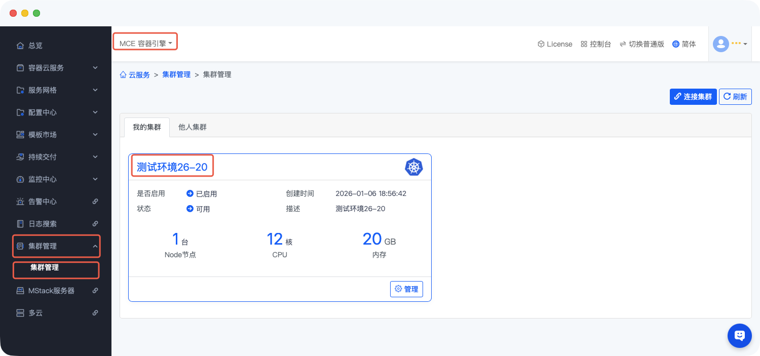 - 登录漫道云MStack平台,在功能模块导航区找到并点击【容器引擎管理】;