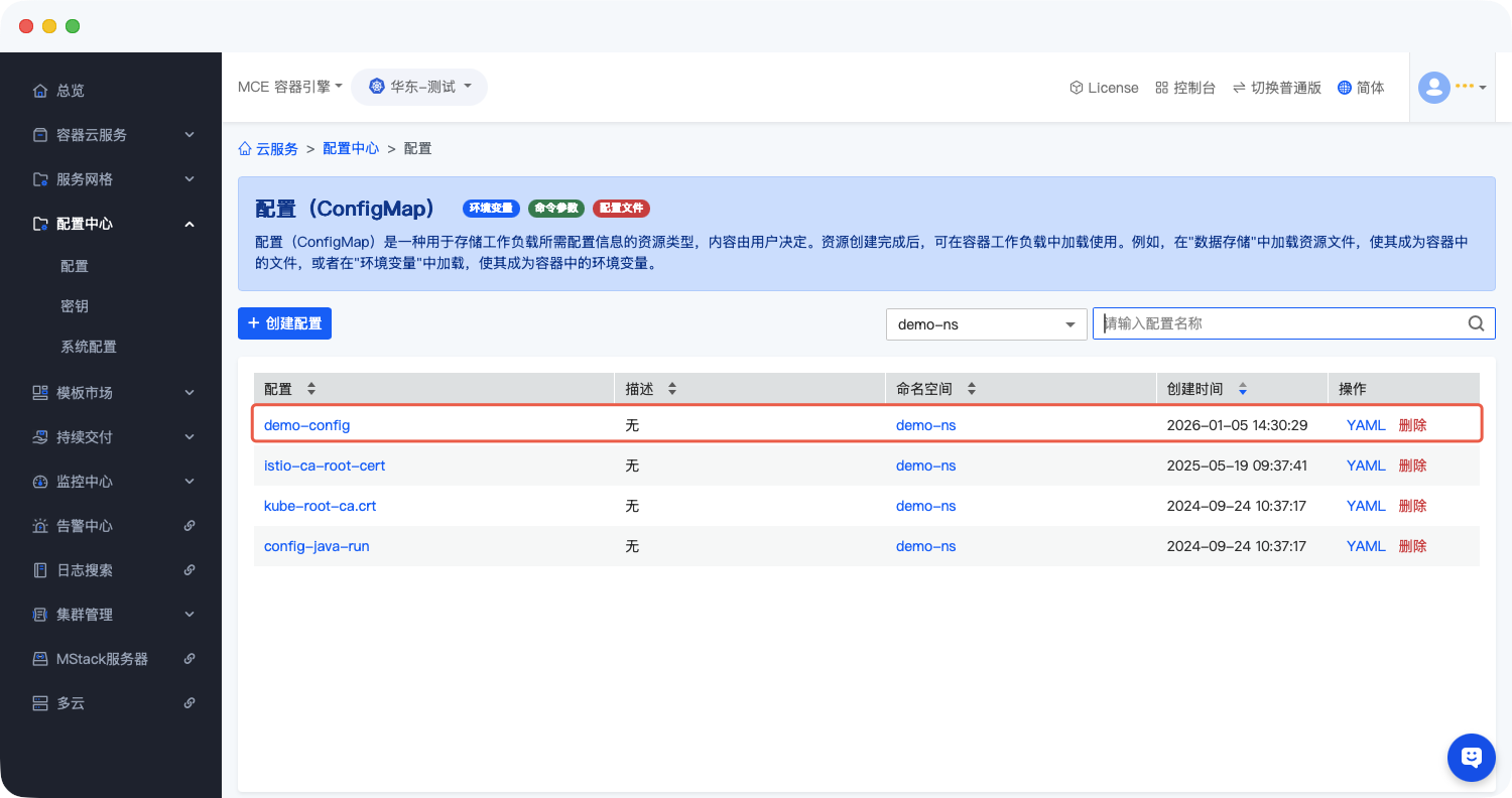 - 进入MCE容器引擎后,在左侧导航菜单中,依次点击【容器云服务】→【配置中心】→【配置】,跳转至配置列表页面;