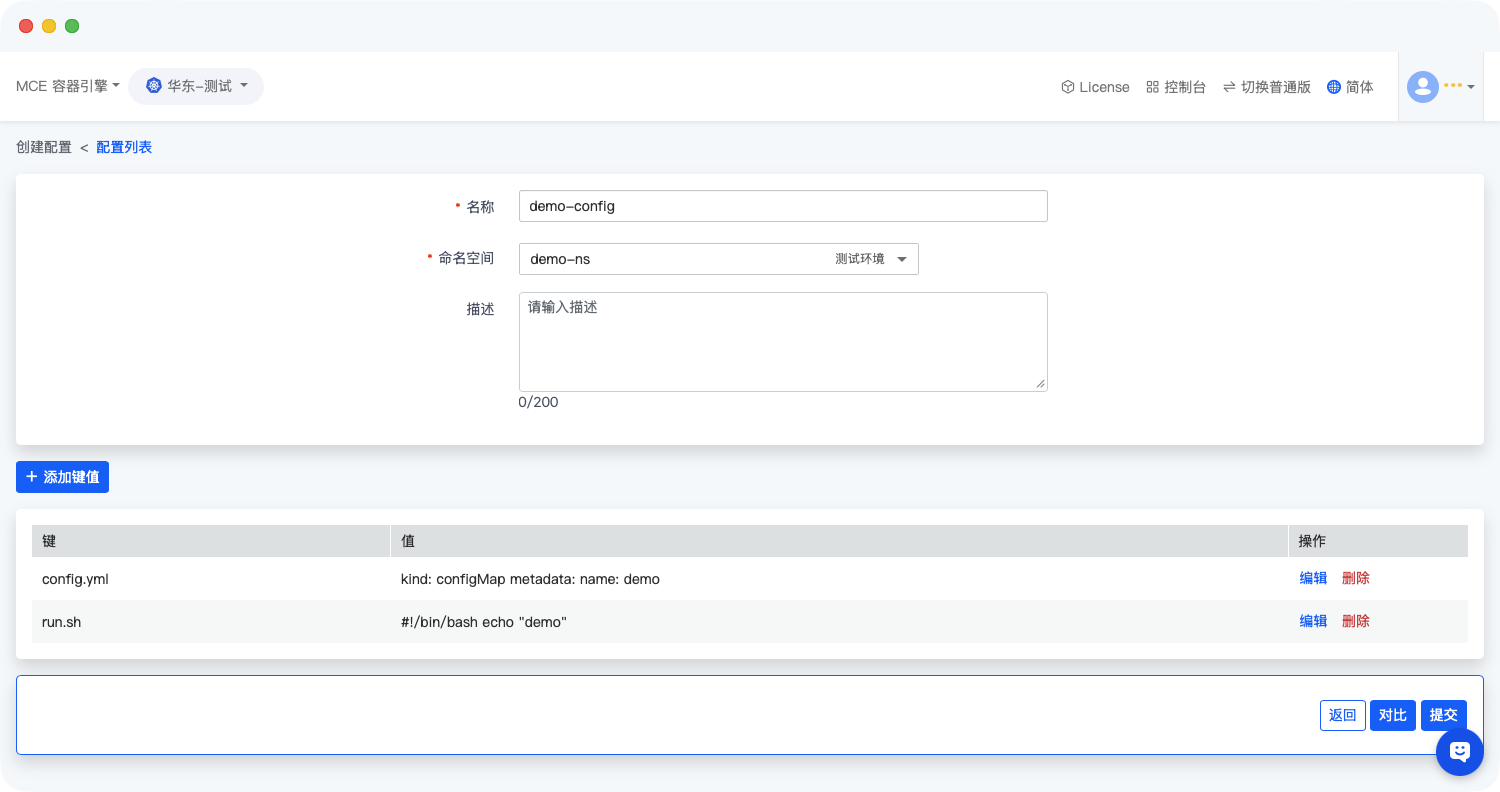 注意事项:1. ConfigMap仅用于存储非敏感配置信息,敏感信息(如密码、密钥等)请使用Secret资源;2. 键值对的键名不可重复,否则会导致创建失败;3. 若后续需修改配置信息,可在配置列表页找到目标ConfigMap,点击【编辑】进入编辑页面操作。