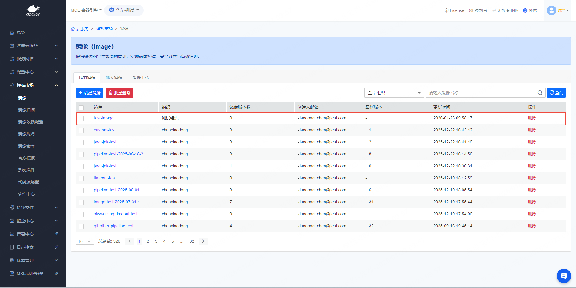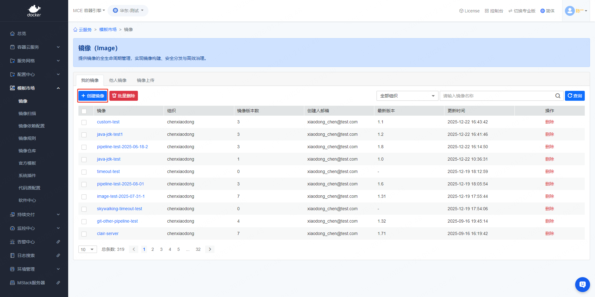 - 左侧导航栏依次点击【模板市场】->【镜像】,即可进入镜像管理页面