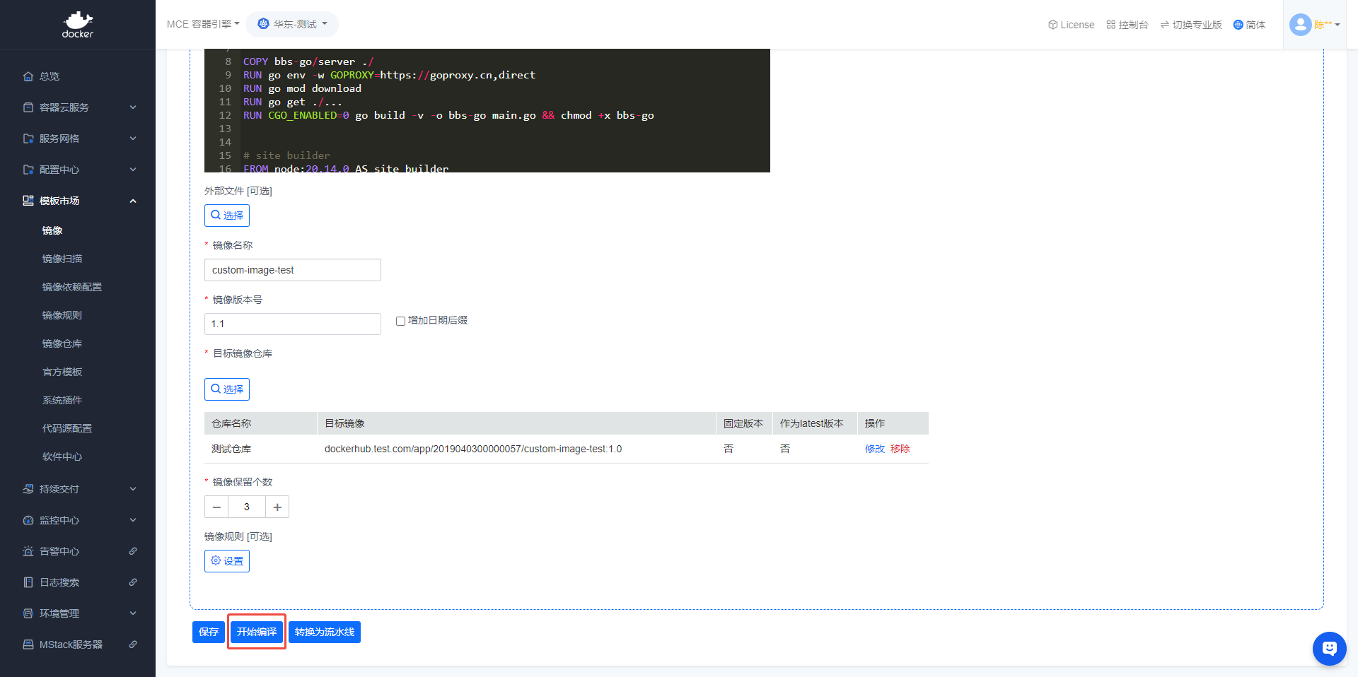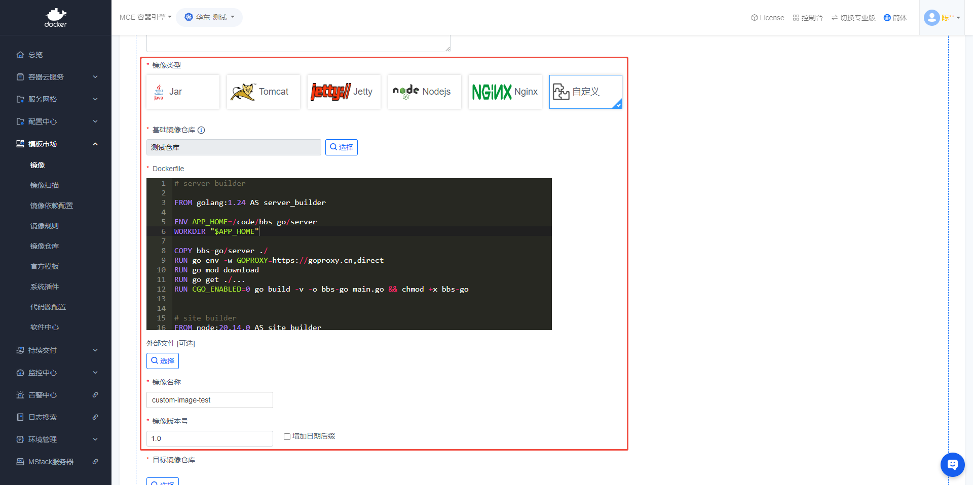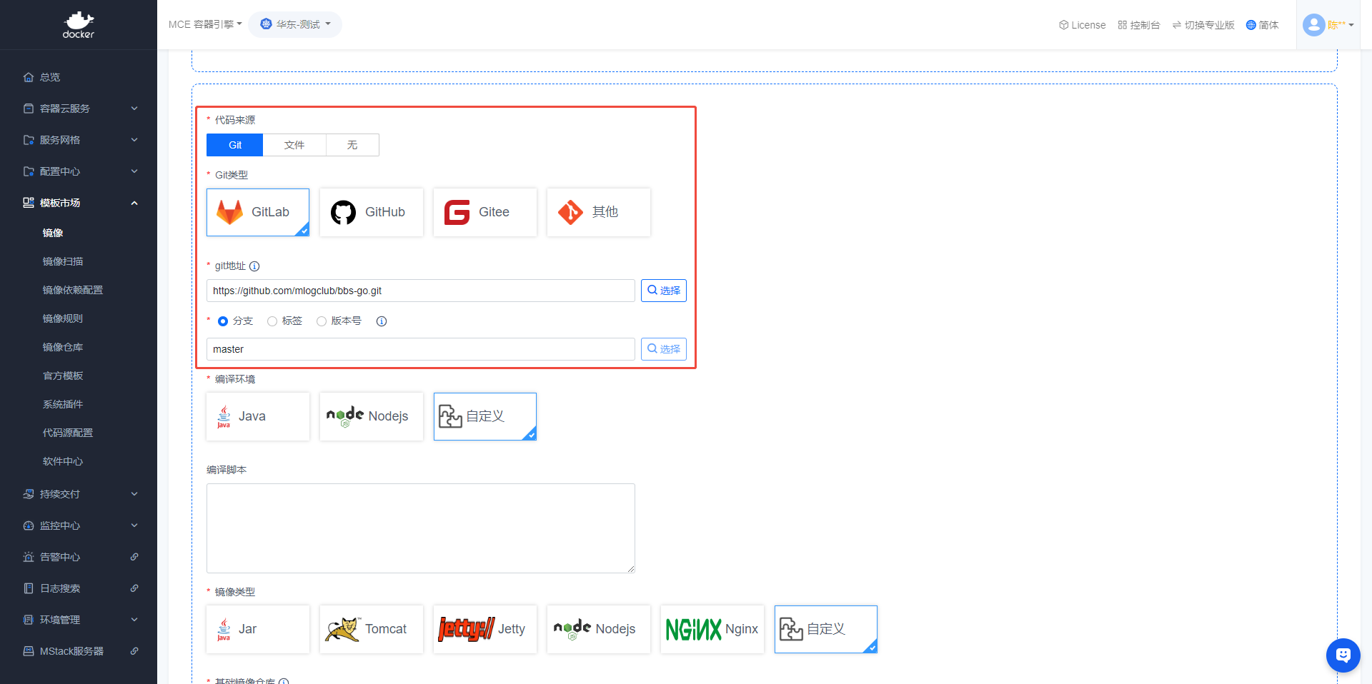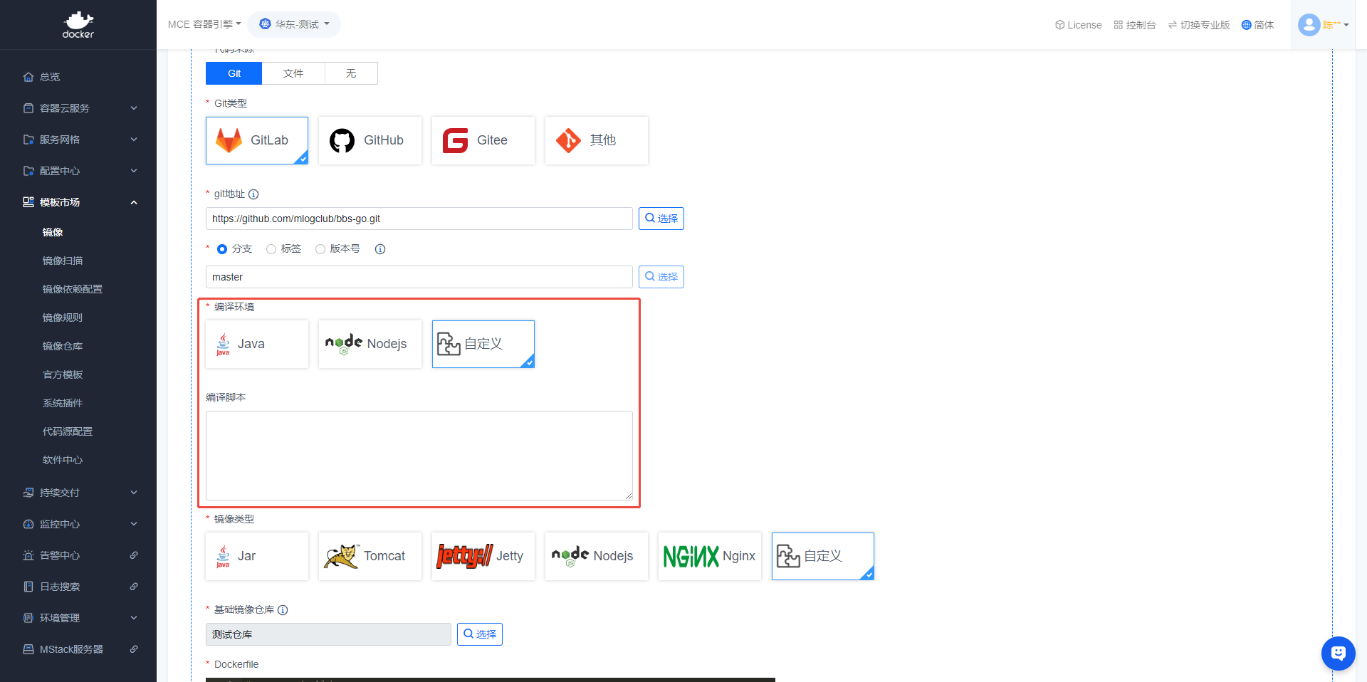 - 【基础镜像仓库】使用默认即可,如果没有那么需先配置【镜像仓库】,配置方法参考:创建镜像仓库