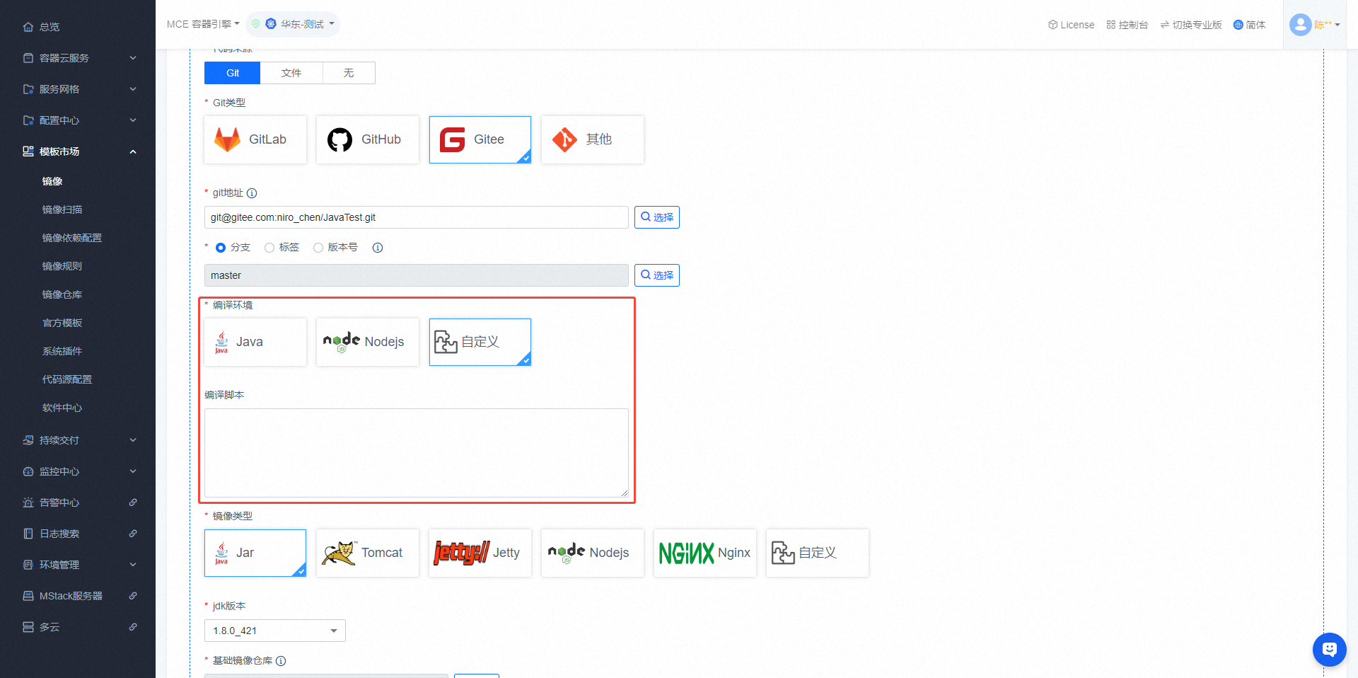 - 项目代码的编译环境,支持java、nodejs、自定义