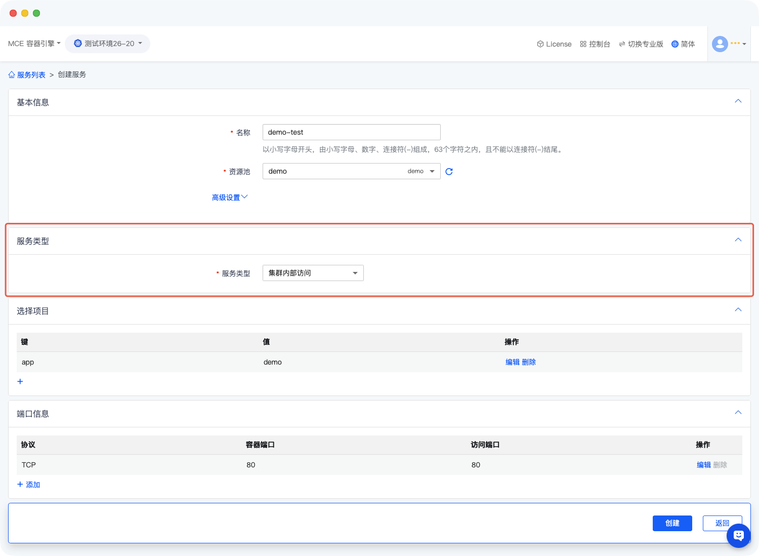 在服务配置页面,首先完成基础信息设置,核心配置为:在「demo」空间下,创建名为「demo-test」的服务(其他基础信息如描述可根据实际需求补充)。