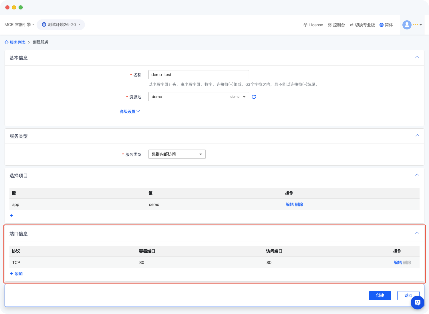 端口配置是服务访问的核心环节,需准确填写端口映射关系(如容器端口、访问端口、协议类型等),确保与后端「demo」工作负载的端口配置匹配,避免访问失败。