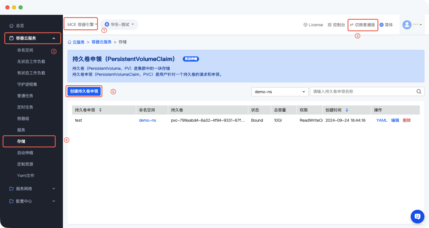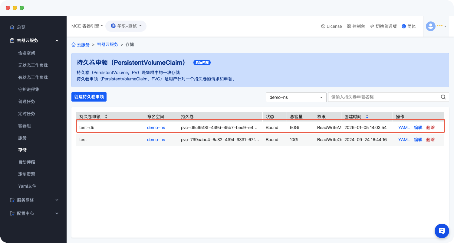 - 进入MCE容器引擎后,在左侧导航菜单中,依次点击【容器云服务】→【存储】,跳转至存储列表页面;