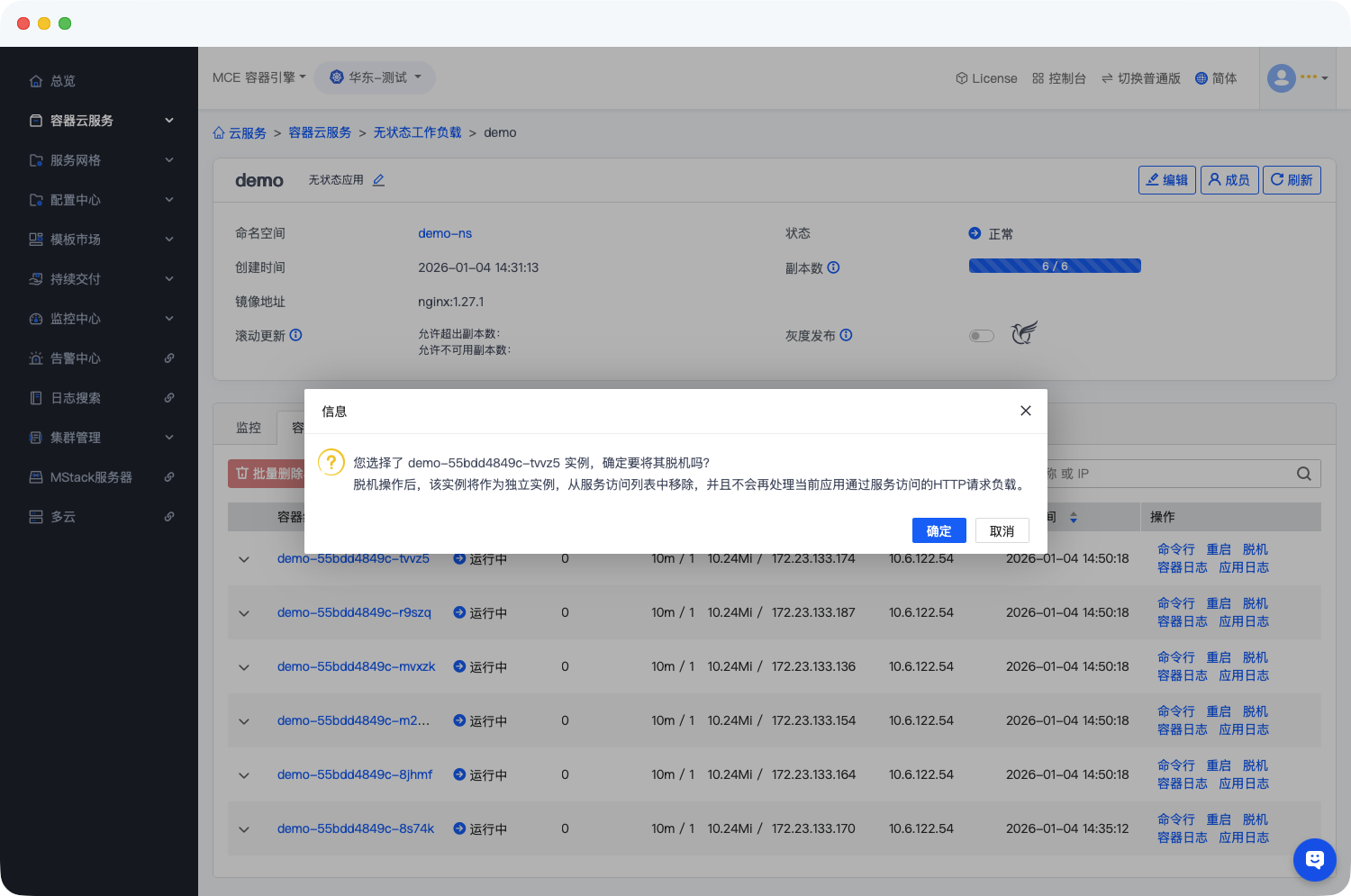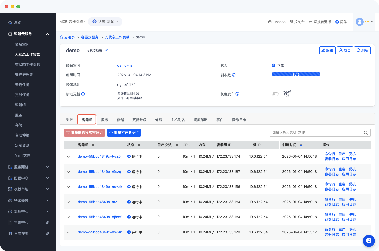 - 进入MCE容器引擎后,在左侧导航菜单中,依次点击【容器云服务】→【无状态应用】,进入无状态应用列表页;