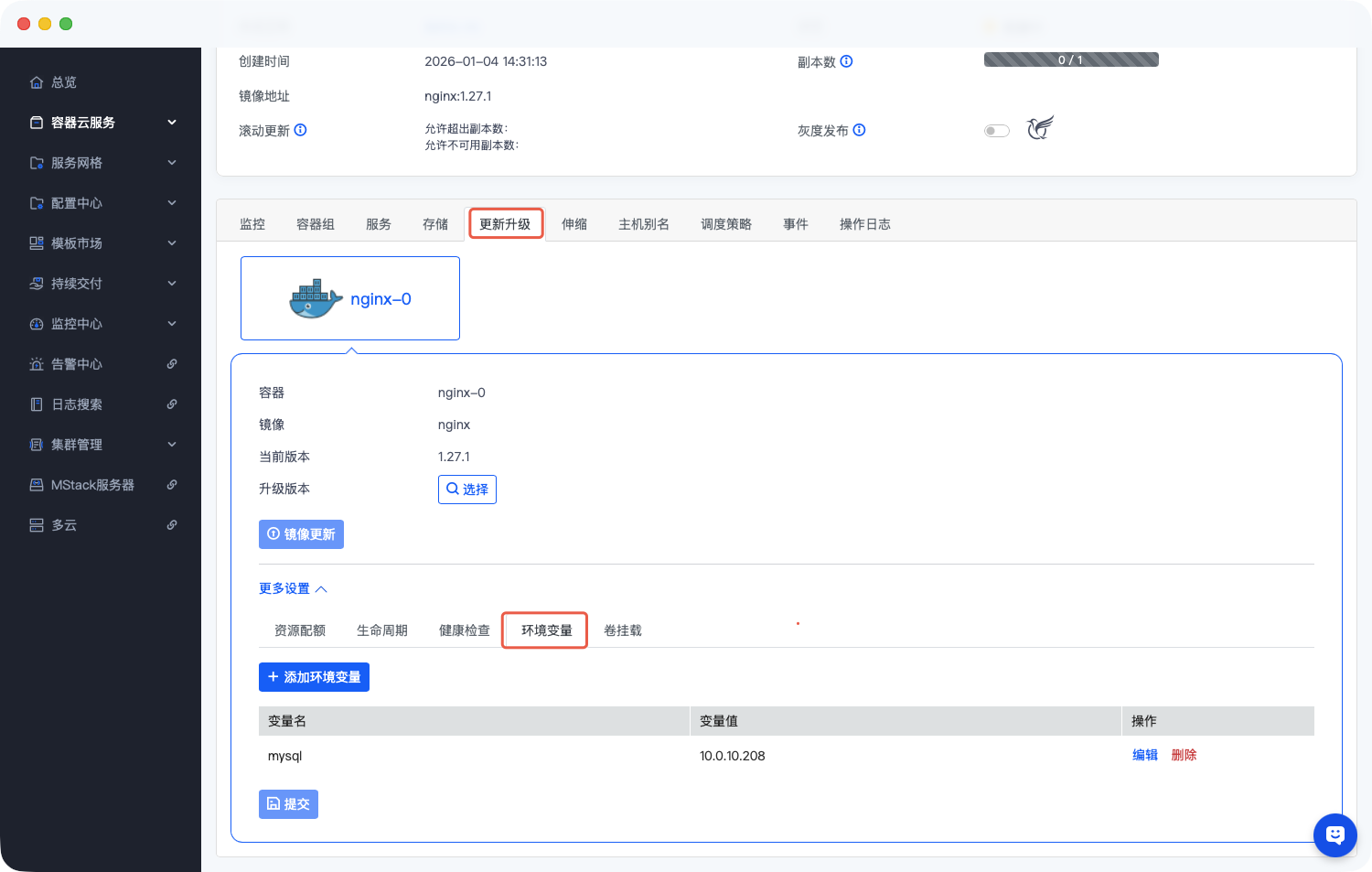 - 提交完成后,返回应用详情页面,查看应用状态,确保容器重启后正常运行;可通过容器终端执行env命令,验证环境变量是否生效。