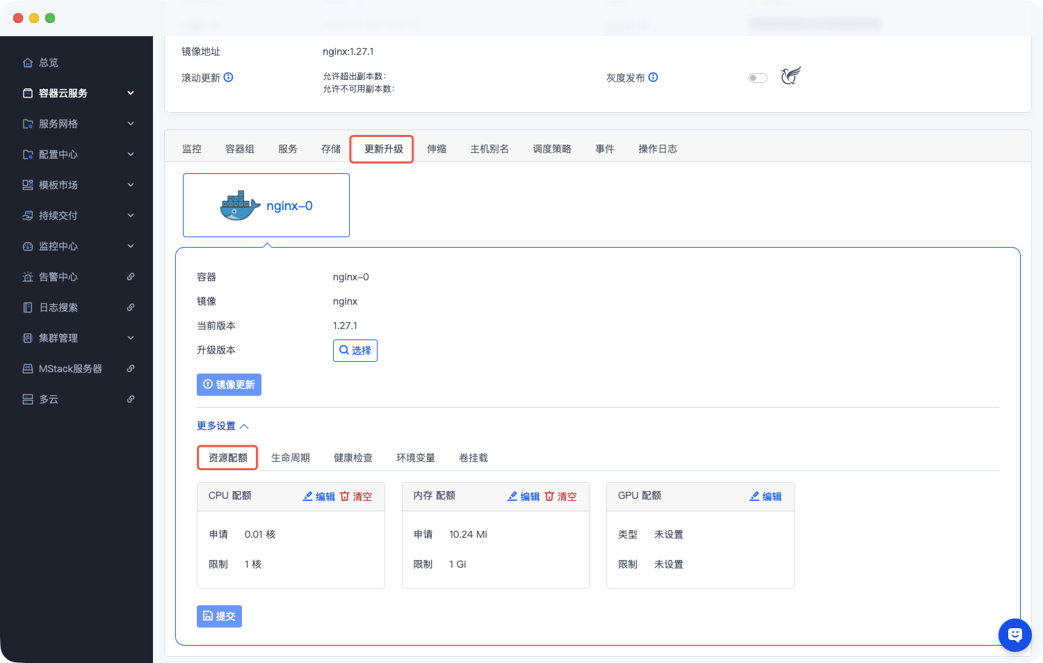 资源配置界面主要包含CPU请求、CPU限制、内存请求、内存限制及GPU配置等核心配置项,其中GPU支持NVIDIA、INTEL、AMD三种类型,具体调整步骤如下: