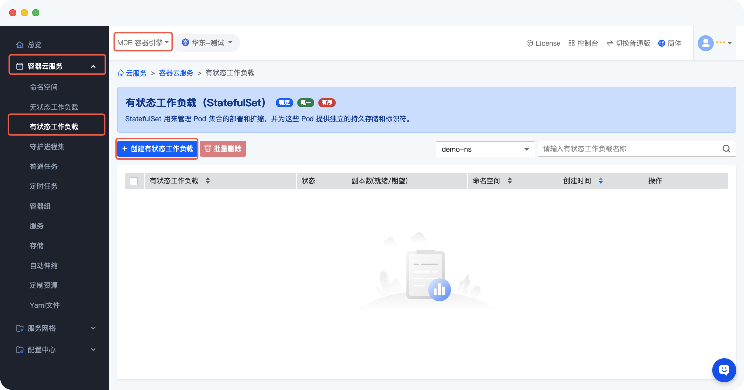 - 进入有状态应用列表页(操作路径:「MCE容器引擎」→「容器云服务」→「有状态应用」);