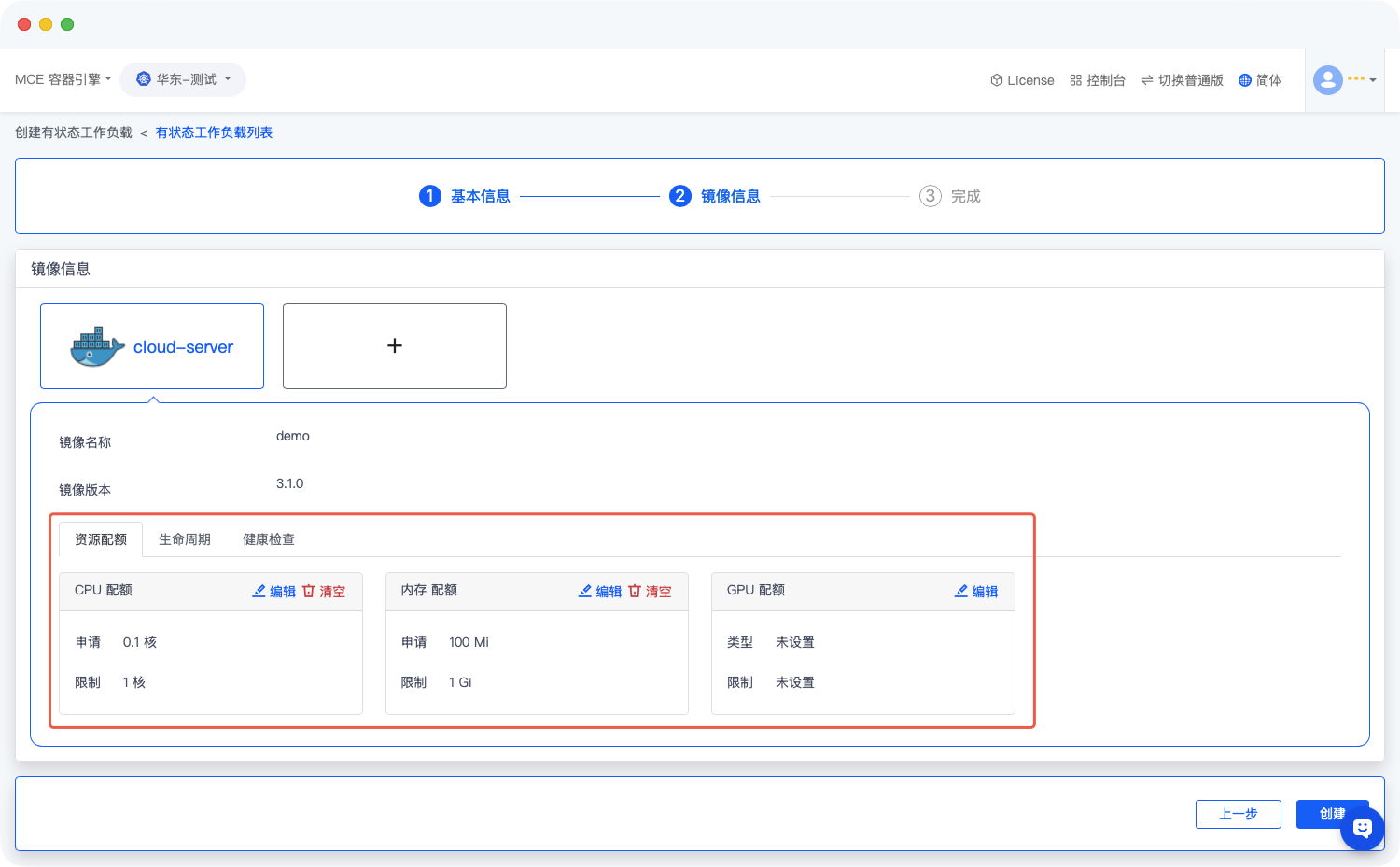 根据应用运行需求,在对应页面填写容器相关配置,包括但不限于资源限制(CPU/内存)、环境变量、卷挂载(适配有状态应用持久化需求)等。