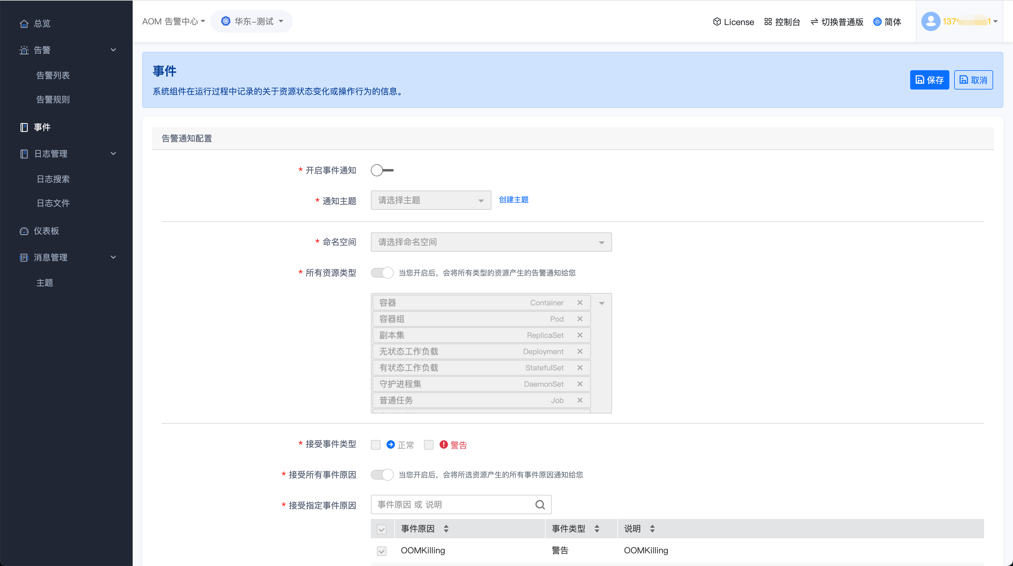 选择通知主题:从下拉列表中选择已创建的主题,用于接收事件通知。