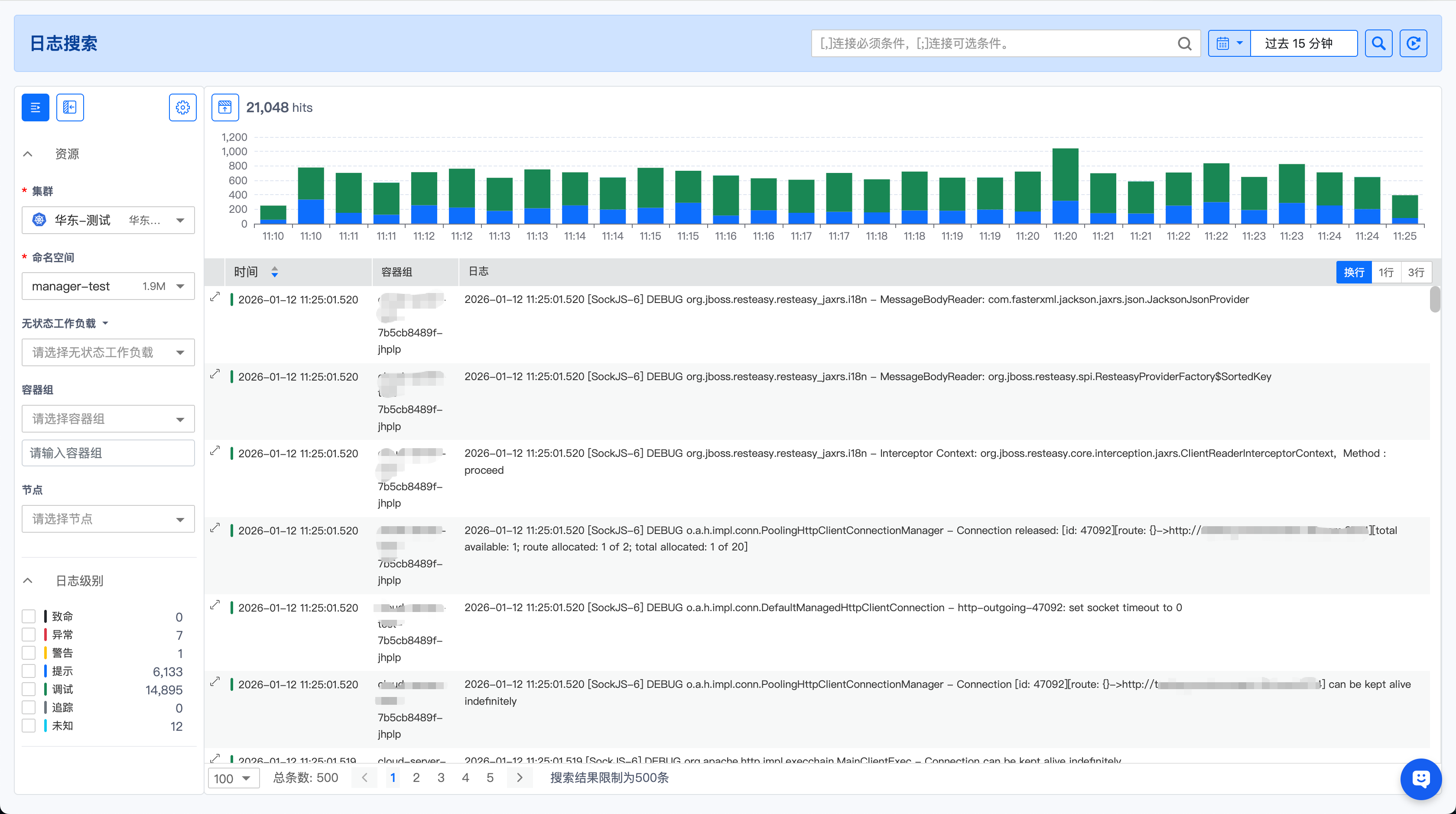 日志检索是告警中心的核心功能之一,支持用户通过关键词、时间范围、日志级别、服务模块等条件快速定位目标日志,帮助运维人员高效排查故障、分析异常原因。通过灵活的查询语法和可视化界面,您可以轻松从海量日志中提取关键信息。