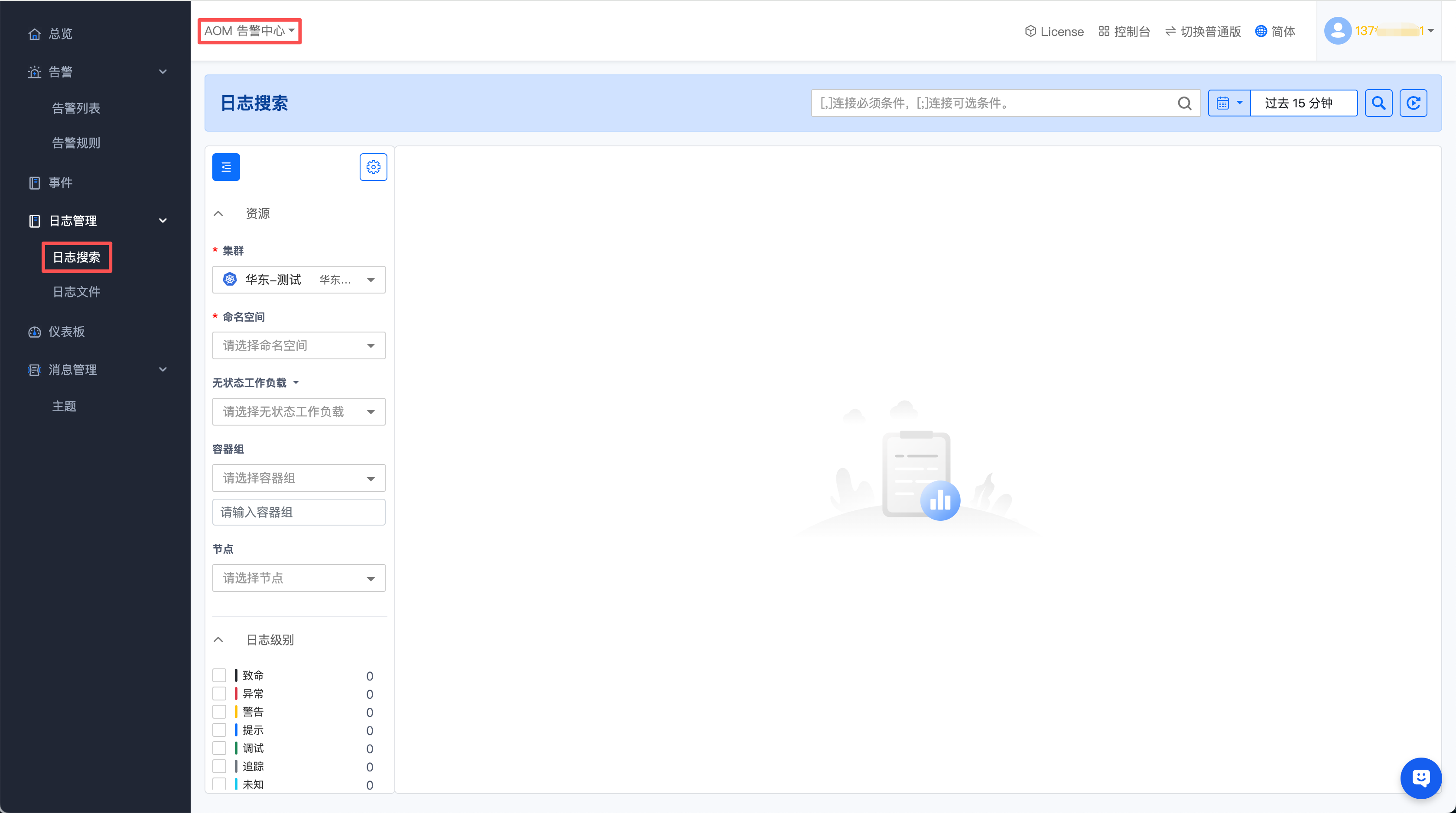 - 在左侧导航栏点击【日志管理】 -> 【日志搜索】,即可进入【日志搜索】页面。