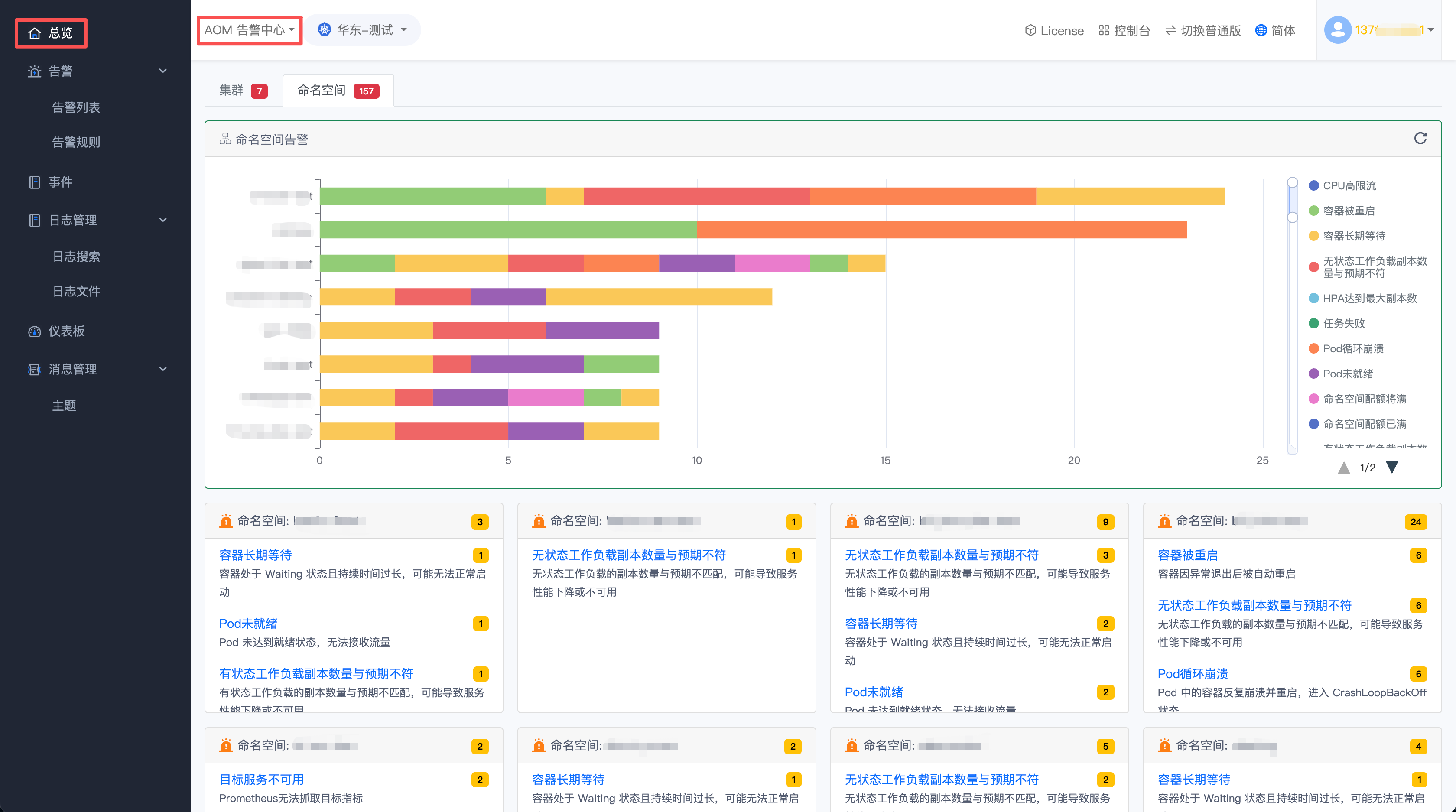 点击集群告警或者命名空间告警,可以分别看到不同维度的告警。
