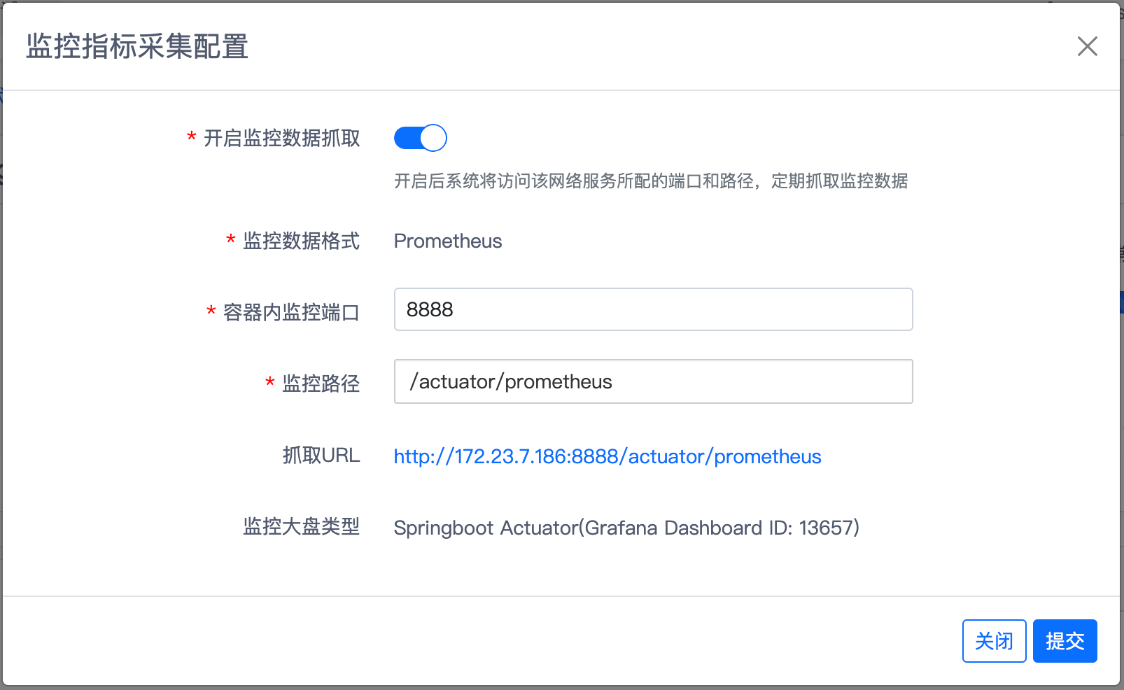 | 监控路径 | 目标服务上提供监控数据的 HTTP 路径。 | /actuator/prometheus |