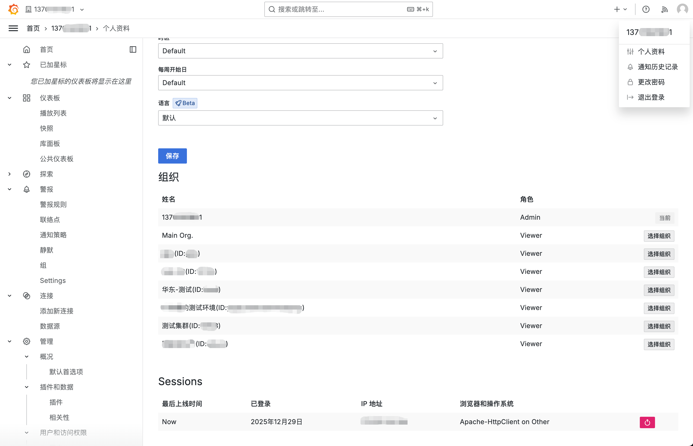 | 个人专属组织 | 管理员权限 | 拥有完全控制权,可创建仪表盘、添加数据源等 |