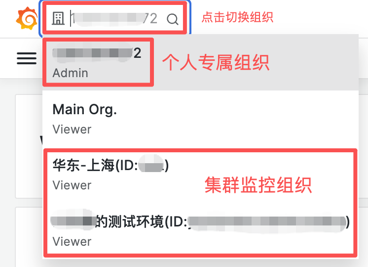 首次进入图表中心,需要从用户组织切换进入相应的集群组织。