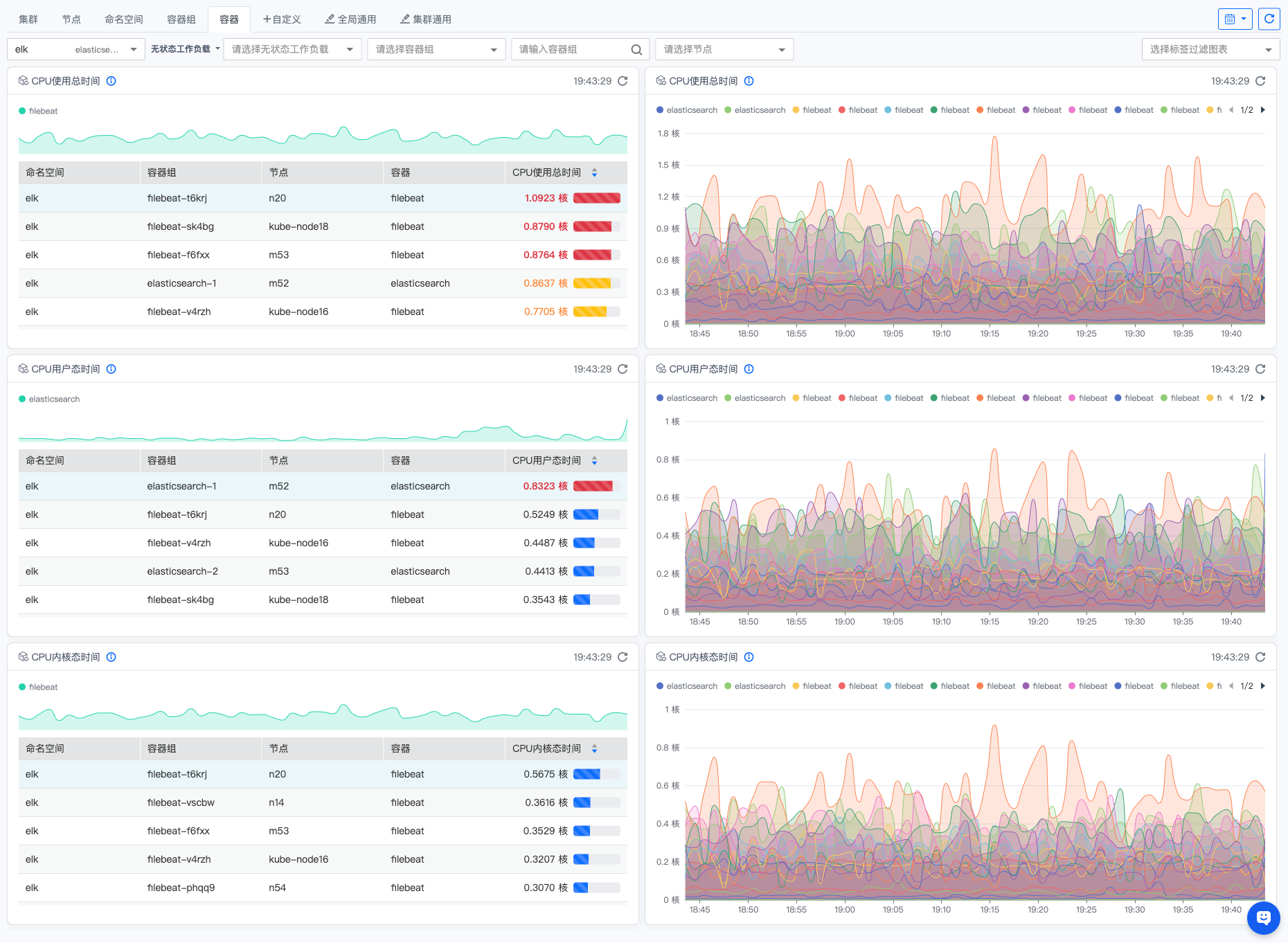 容器维度监控图表深入到Pod内部,对每个独立的应用容器进行精细化监控。它展示容器级别的进程级资源消耗(如CPU、内存、文件描述符)、应用关键指标(如JVM堆栈、Golang协程、请求延迟)以及标准/错误输出日志。该视图是实现根因分析的最后一步,帮助开发者精确识别应用代码性能瓶颈、内存泄漏或配置错误等深层次问题。