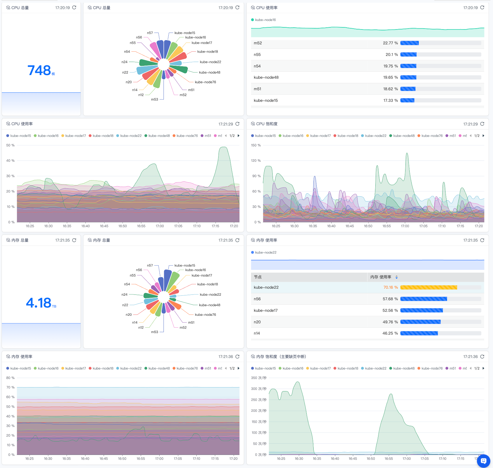 节点维度监控模块聚焦于单台主机或虚拟机的运行状态,深入监控CPU、内存、磁盘、网络等基础资源使用情况,并结合节点上的容器实例、系统事件与告警信息,实现对节点性能瓶颈、异常行为与故障风险的精细化洞察,保障节点层面的稳定性与可靠性。