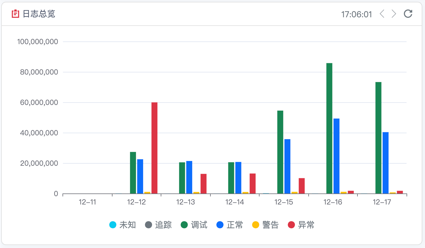 日志总览图表是一个直观的可视化工具,用于展示系统在指定时间范围内(例如一周)的日志量变化趋势,并按日志级别进行分类统计。通过该图表,运维人员、开发人员或系统管理员可以快速了解系统的运行状态、异常波动情况以及不同级别日志的分布,从而辅助问题定位、性能监控和系统健康度评估。