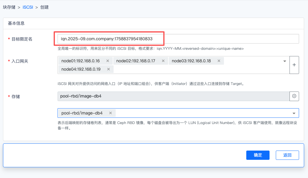 目标限定名(IQN):格式要求:iqn.YYYY-MM.<reversed-domain>:<unique-name>入口网关:向外提供服务的节点存储:选择刚创建的卷