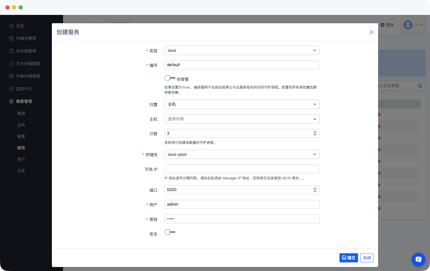 | 计数 | 设置iSCSI服务的实例数量 | 根据业务并发需求配置,单集群建议至少部署2个实例以保障高可用 |