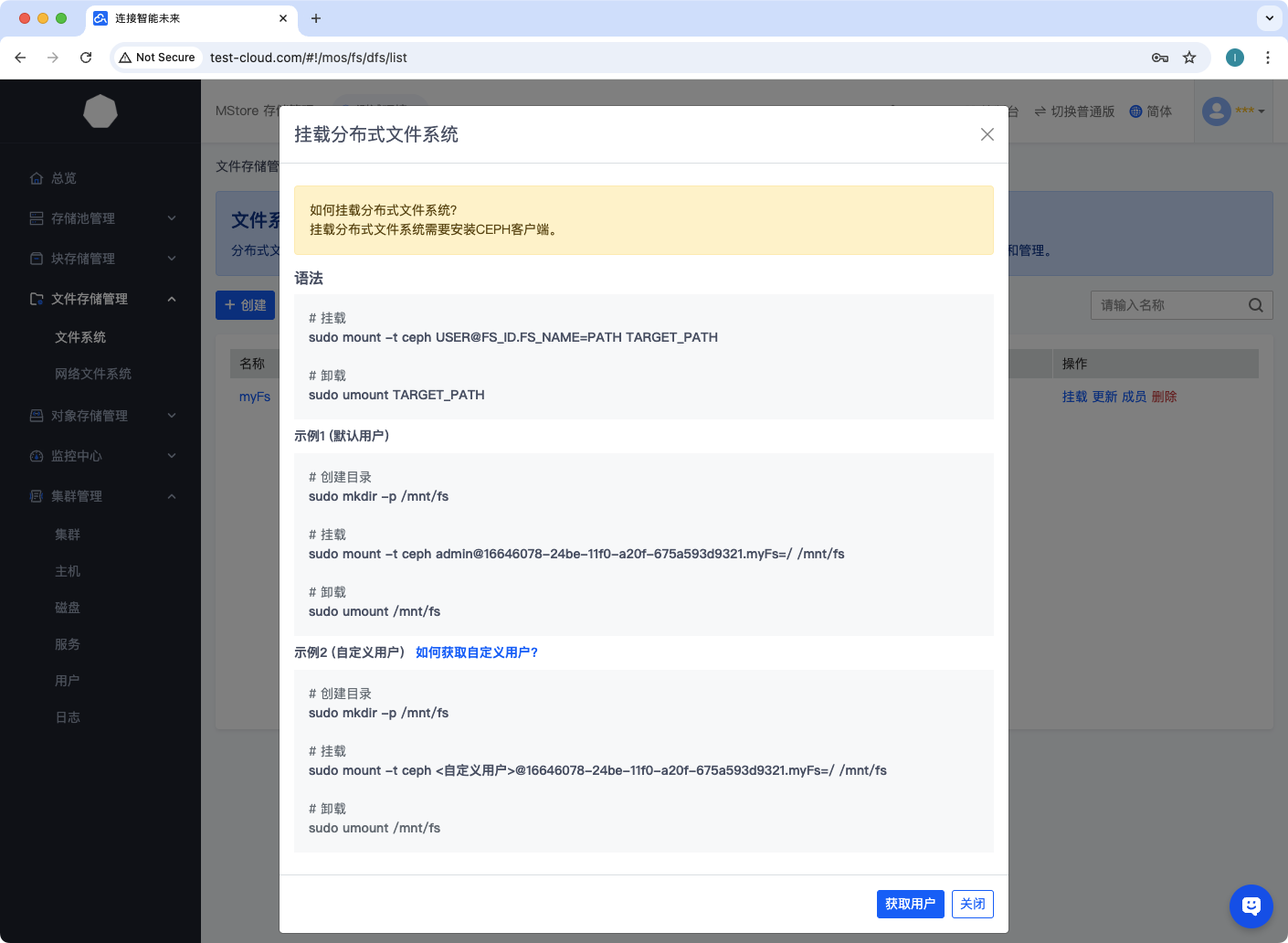通过分布式存储管理平台的可视化界面,可快速获取文件系统的挂载连接信息,操作步骤如下: