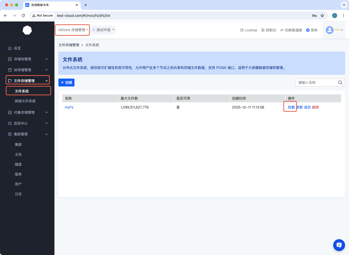- 登录存储管理平台,在左侧导航栏找到【文件系统】模块并点击进入;
