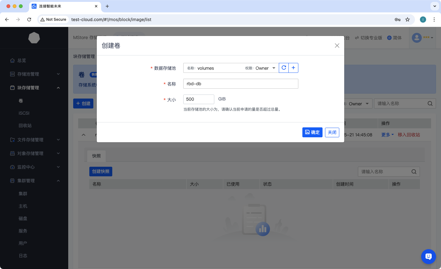 - 点击弹窗右下角【确定】按钮,系统开始创建卷,创建成功后会在列表中刷新显示;