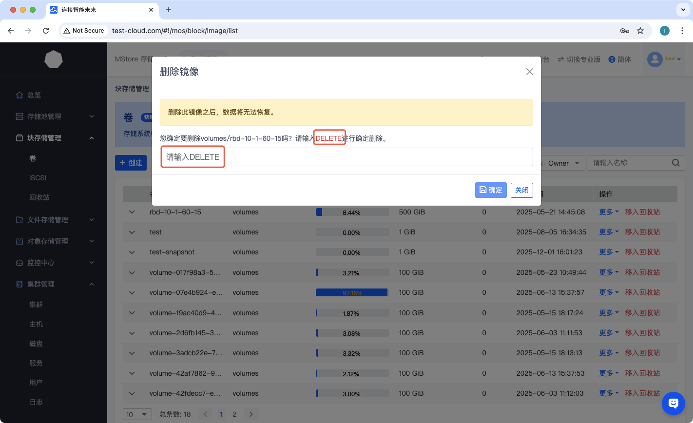 - 仔细阅读弹窗提示:“删除此镜像之后,数据将无法恢复,需谨慎操作”,再次确认目标卷已无业务依赖;