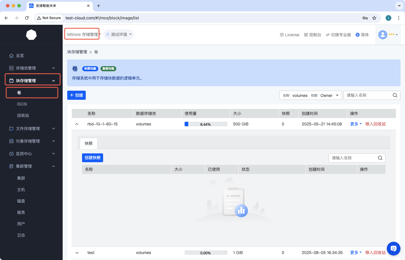 - 在左侧导航栏中,依次点击【存储块管理】→【卷】,即可进入卷列表页面。