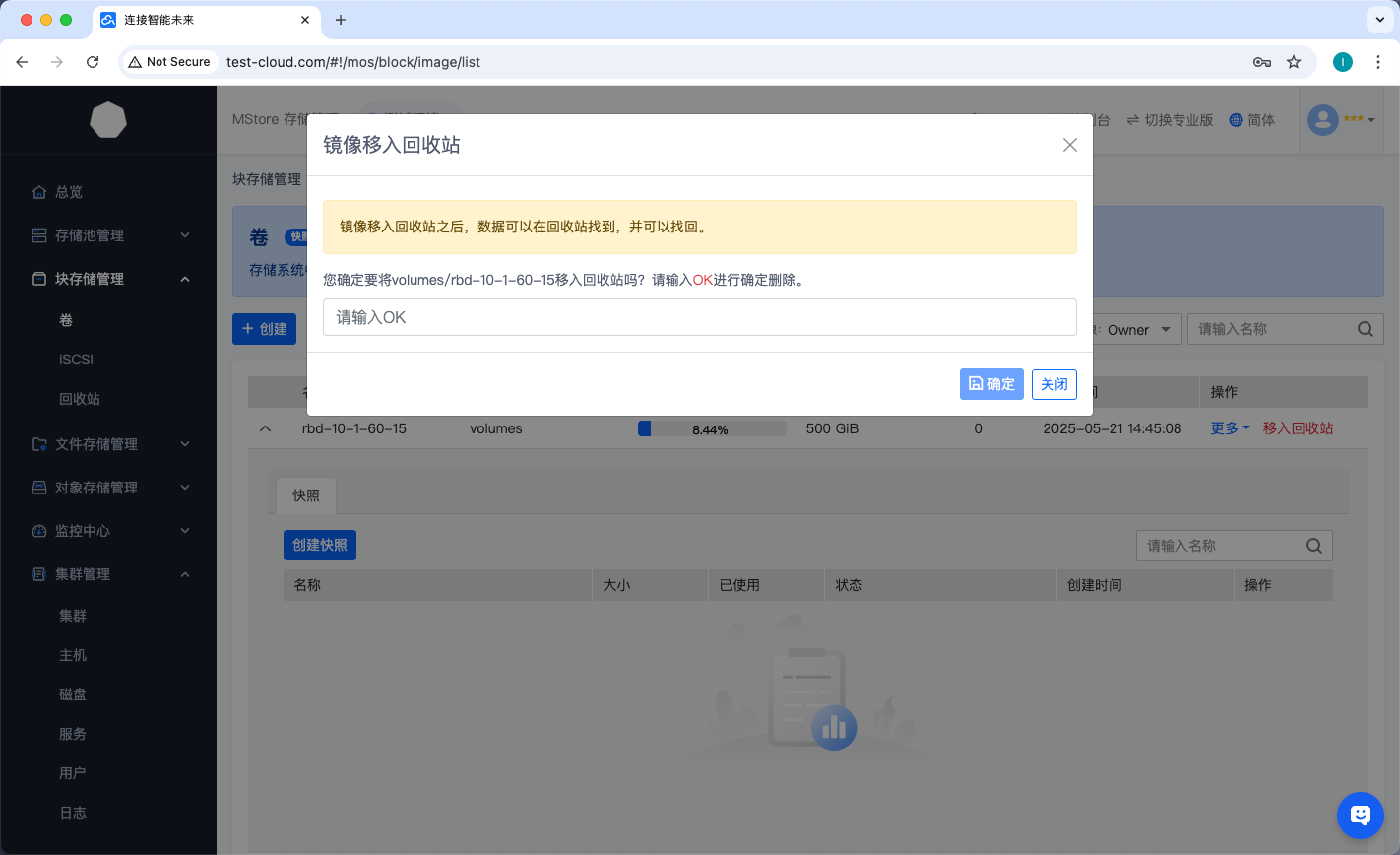 - 阅读弹窗提示:“镜像移入回收站之后,数据可在回收站找到并找回”,确认操作意图;